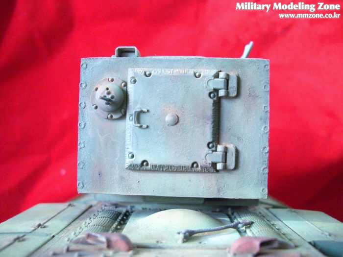 아주 평탄한 포탑장갑은 두텁고 거친 느낌을 주려고 표면에 강판질감을 내주었습니다. 무수지 접착제를 여러번 바른뒤, 황동브러쉬로 사정없이 두드린후 타미야 퍼티를 군데군데 펴바르고 약간의 사포질로 마무리. 불규칙한 표면을 만들어 봤습니다.
