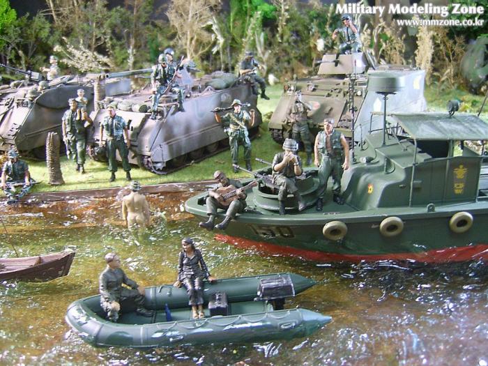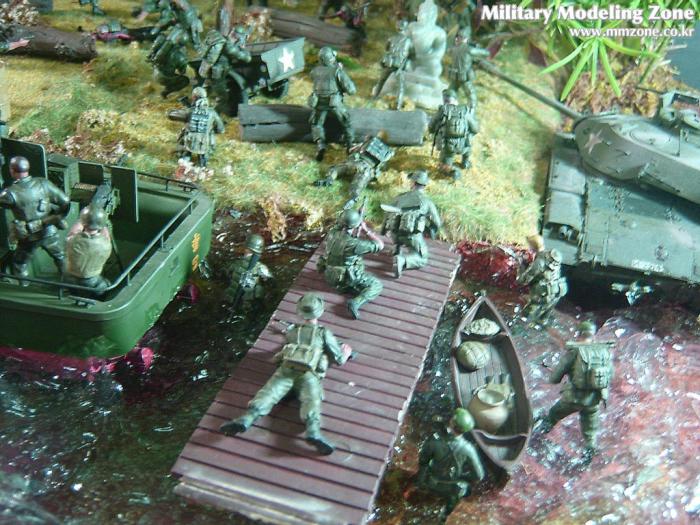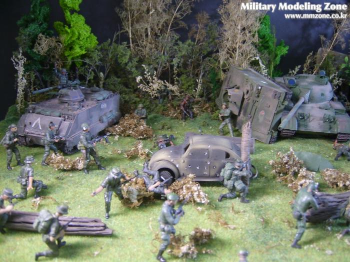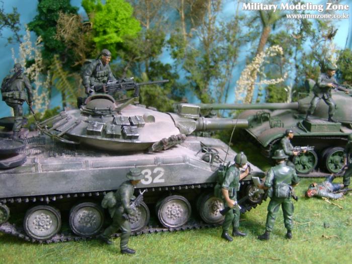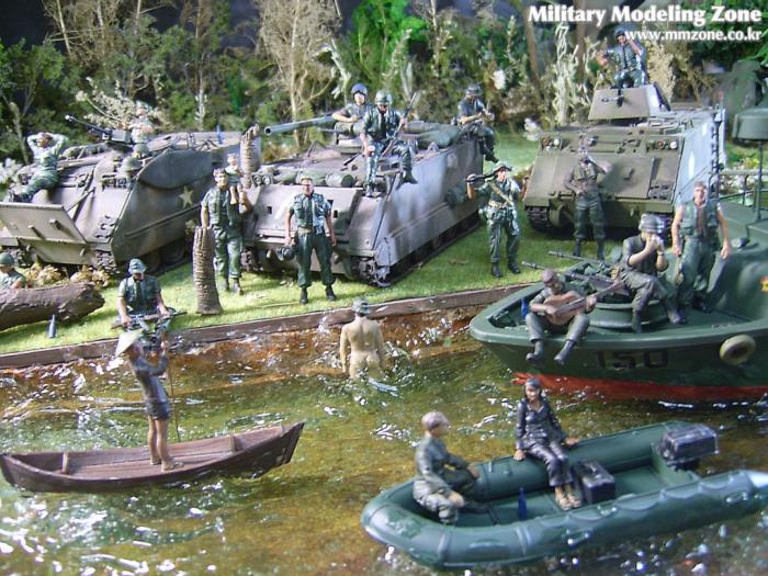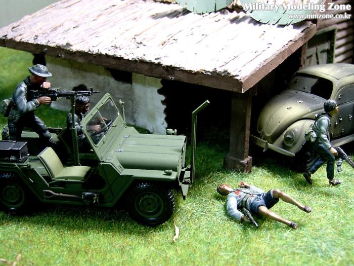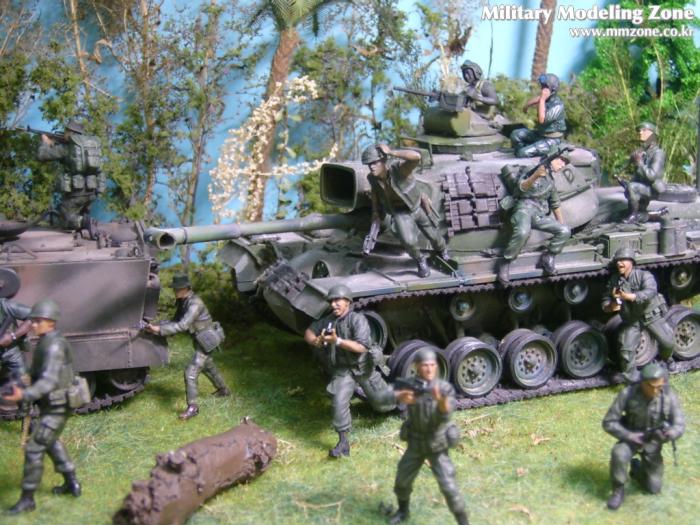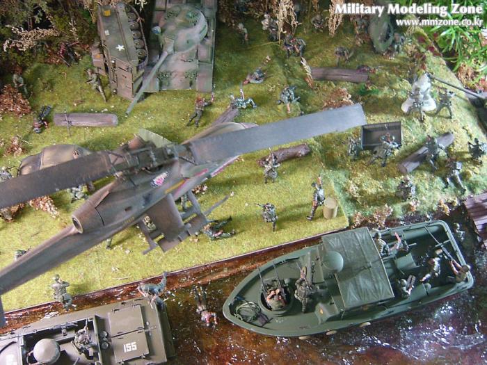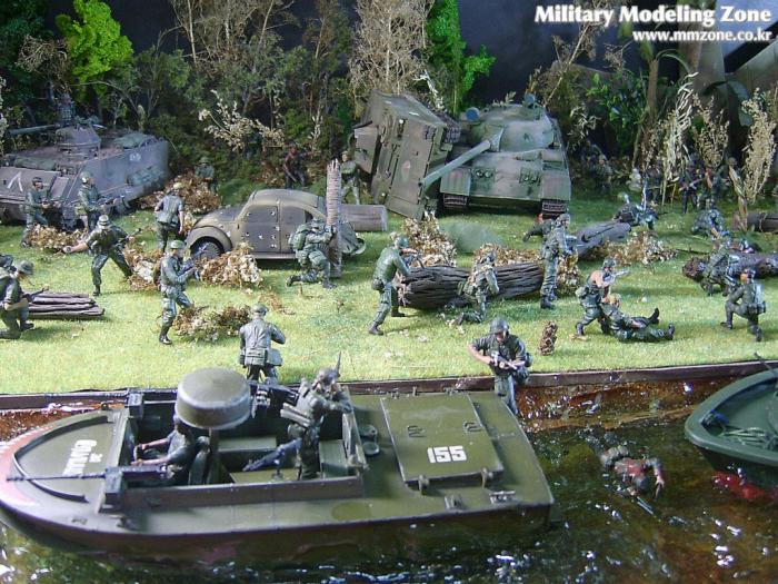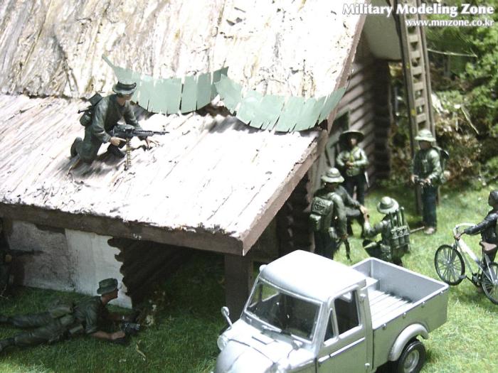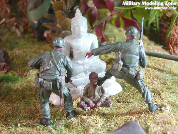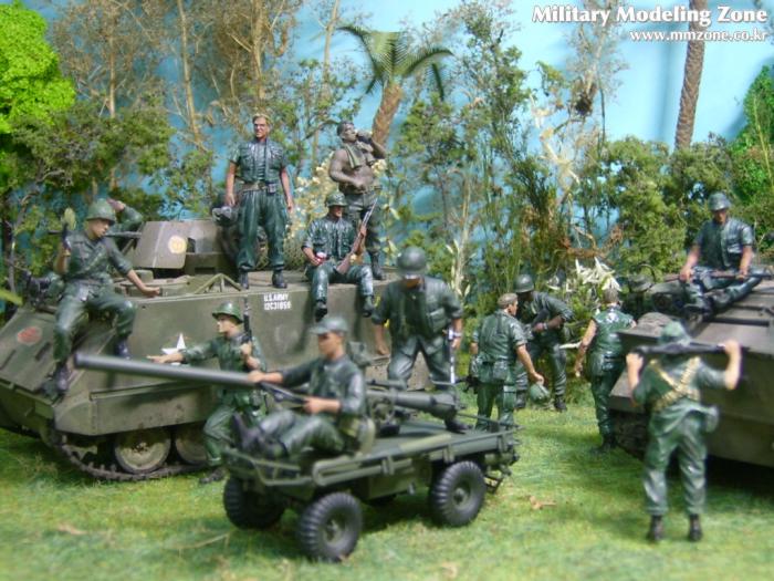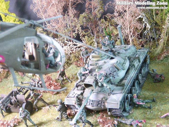 아마 이번 작품은 제 유작이 될 뻔했습니다. 사회일에, 미국으로 가려는 준비(한달 뒤 떠납니다)그리고 새벽마다 새벽잠을 쪼개는 작업, 결국 입원했고 푹 쉬어야 산다고해서 2주간 병원침대에 누워 있었습니다(한주는 제 휴가 기간이었는데 병상에서--). 하긴 지난 몇년간 모형에 너무나 많은 시간과 노력을 바쳐 왔던게 사실입니다. 사실 이번 월남전 플랜도 처음에는 -과거에 대규모 물량투입을 못 마땅하게 보시는 분들이 많아서- 정말 멋있게 인형10개 정도만 만들고 소규모 디오라마를 만들 예정이었습니다. 그런데 이게 욕심에 욕심을 물어 결국 사고싶은 물량을 다 구입하고 150개가 넘는 인형과 적지 않은 도구들을 만들게 되었습니다. 또 이번 제작을 위해서 현지에도 가보고 많은 사람들과 이야기를 나누웠습니다. 월남 파병자료나 파병되셨던 분들과 이야기를 많이 나누고 자료도 많이 찾아 보았습니다. 월남전은 심지어는 M8 까지 굴러 다닐정도로 무기체제에 혼합이 이루어졌던 전쟁입니다. 이번에도 괜히 크게 만드는거 아냐 하는 자책이 들면서도 한편으로는 아무도 안 만드니 나라도 한번 만들어 보자는 욕심이 들었습니다. 한편 대테러 디오라마와 영국군 정찰 디오라마-이미 전차와 인형25개 정도 완성-을 동시에 병행하니, 정말 병 날만 하더군요. 그래도 회복되자 마자 사진찍는 것을 보니 정말 미치긴 미쳤나 봅니다. 다만 이번에는 베이스의 세로가 길어서 손을 올릴 자리가 없어서 사진이 마음에 들지 않다는 점이 있지만 그래도