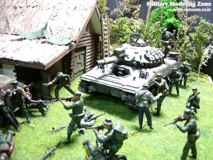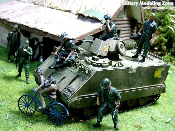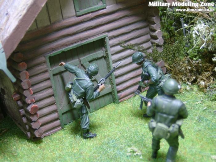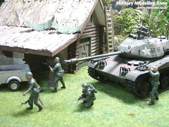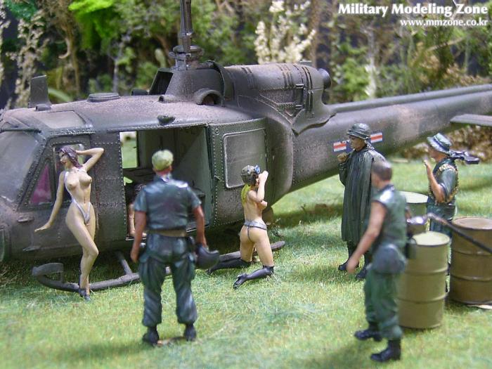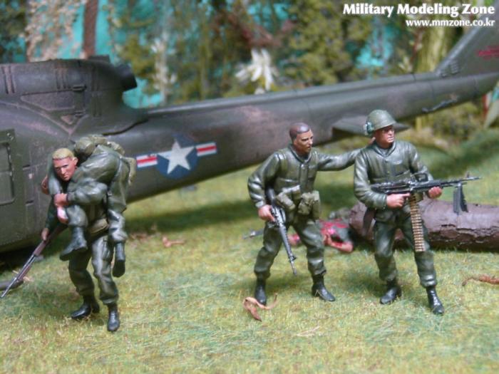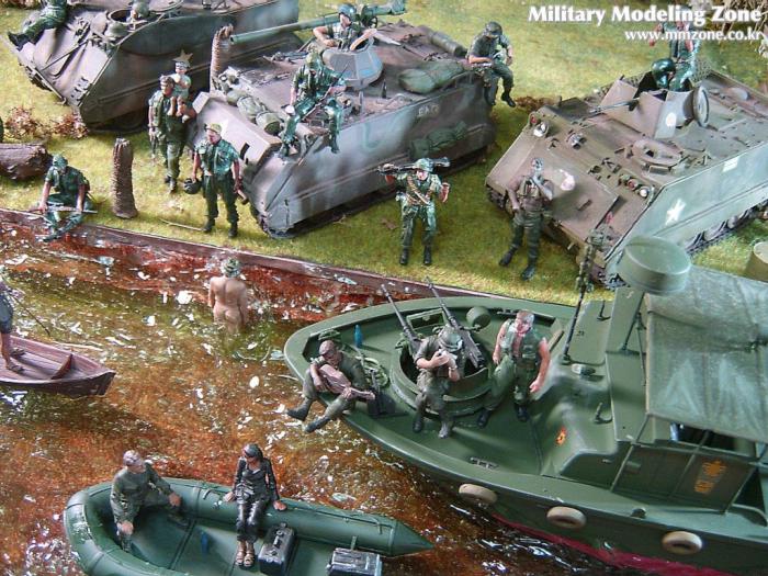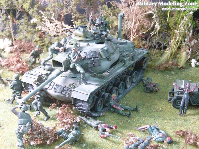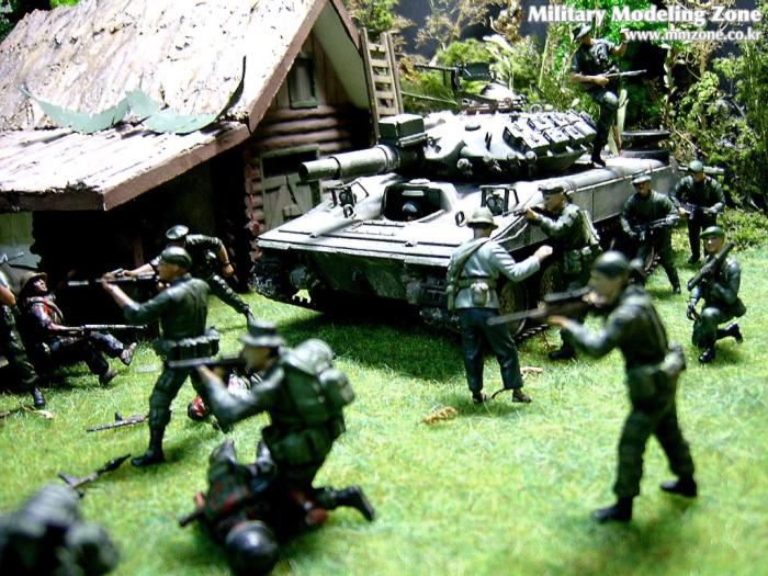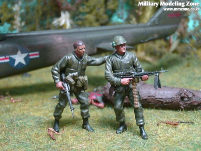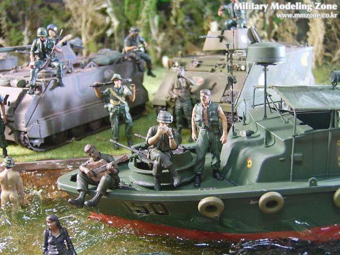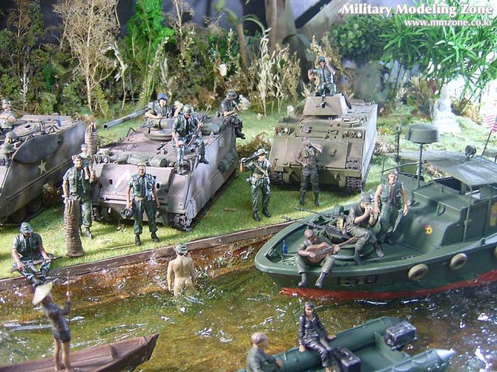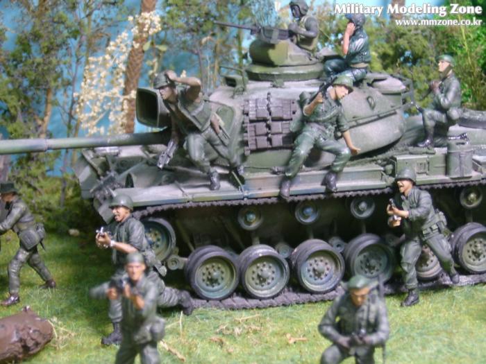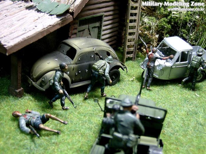 아마 이번 작품은 제 유작이 될 뻔했습니다. 사회일에, 미국으로 가려는 준비(한달 뒤 떠납니다)그리고 새벽마다 새벽잠을 쪼개는 작업, 결국 입원했고 푹 쉬어야 산다고해서 2주간 병원침대에 누워 있었습니다(한주는 제 휴가 기간이었는데 병상에서--). 하긴 지난 몇년간 모형에 너무나 많은 시간과 노력을 바쳐 왔던게 사실입니다. 사실 이번 월남전 플랜도 처음에는 -과거에 대규모 물량투입을 못 마땅하게 보시는 분들이 많아서- 정말 멋있게 인형10개 정도만 만들고 소규모 디오라마를 만들 예정이었습니다. 그런데 이게 욕심에 욕심을 물어 결국 사고싶은 물량을 다 구입하고 150개가 넘는 인형과 적지 않은 도구들을 만들게 되었습니다. 또 이번 제작을 위해서 현지에도 가보고 많은 사람들과 이야기를 나누웠습니다. 월남 파병자료나 파병되셨던 분들과 이야기를 많이 나누고 자료도 많이 찾아 보았습니다. 월남전은 심지어는 M8 까지 굴러 다닐정도로 무기체제에 혼합이 이루어졌던 전쟁입니다. 이번에도 괜히 크게 만드는거 아냐 하는 자책이 들면서도 한편으로는 아무도 안 만드니 나라도 한번 만들어 보자는 욕심이 들었습니다. 한편 대테러 디오라마와 영국군 정찰 디오라마-이미 전차와 인형25개 정도 완성-을 동시에 병행하니, 정말 병 날만 하더군요. 그래도 회복되자 마자 사진찍는 것을 보니 정말 미치긴 미쳤나 봅니다. 다만 이번에는 베이스의 세로가 길어서 손을 올릴 자리가 없어서 사진이 마음에 들지 않다는 점이 있지만 그래도