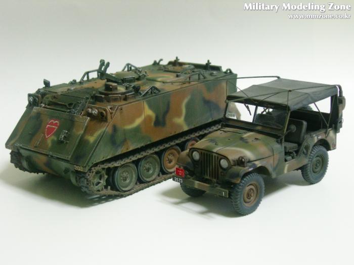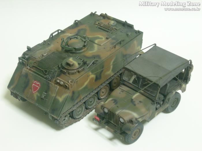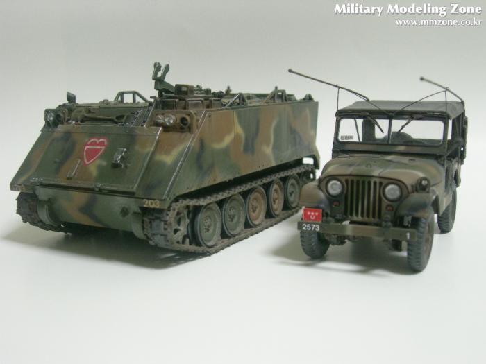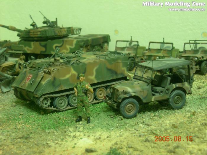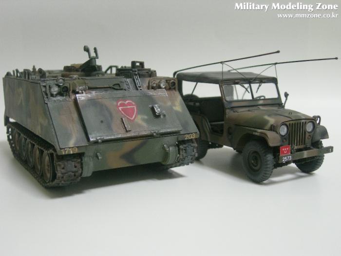 예전에 만들었던 K100(SKYBOW M38A1)과 함께 찍어보았습니다. 옛날 김종덕씨였나 그분이 만드신 M113A1 같이 만들려고 노력했으나 실력부족으로... 아무튼 k100과 나란히 놓았으면 좋겠다고 쓰셨던 의견이 생각나서 이렇게 올려봅니다.