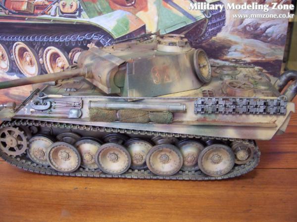 1/25 판터 후기 버젼입니다. 싼 가격에 그냥 무심코 질른 프라모델 입니다. 생각보다 가격대비 만족감은 대단합니다. 위장망과 철사, 그리고 예비용 휠을 포탑 뒷면에 달아 줬습니다. 고증은 안맞을지 몰라도 볼륨감이 상당합니다.^^