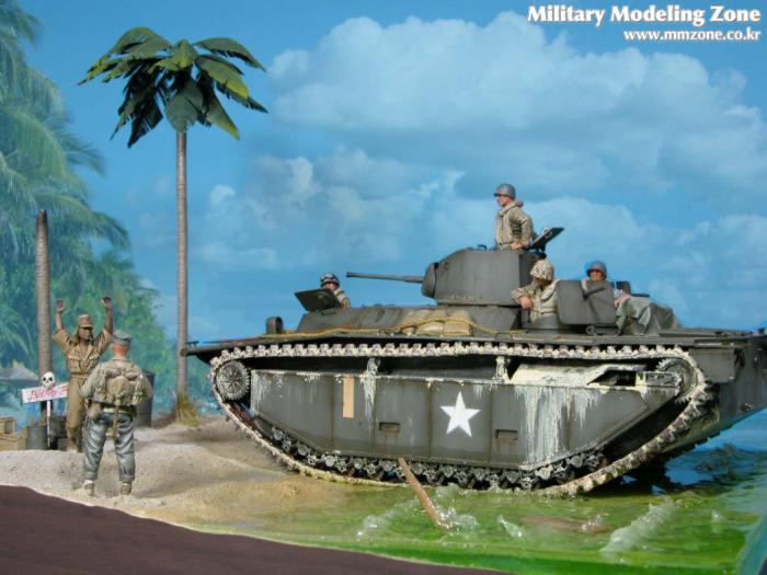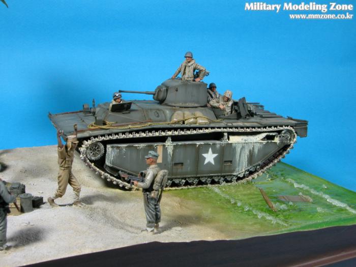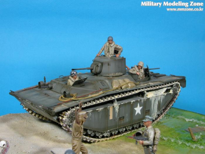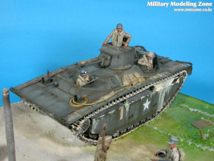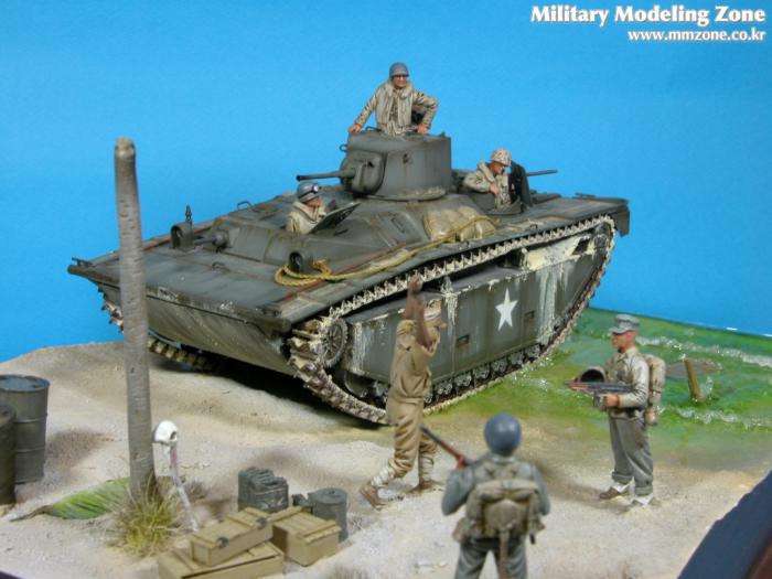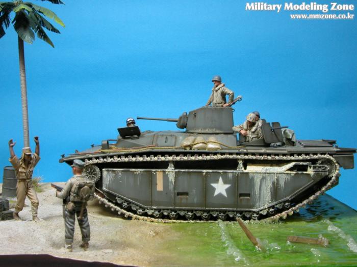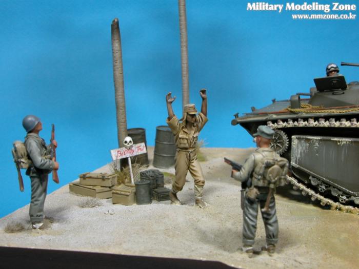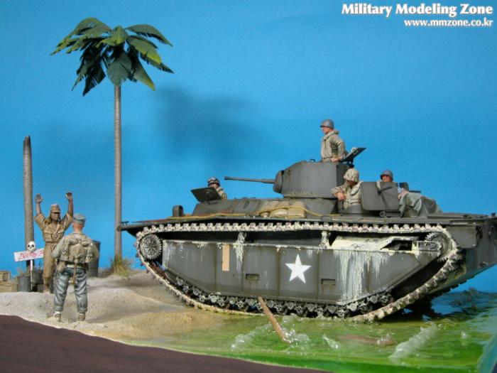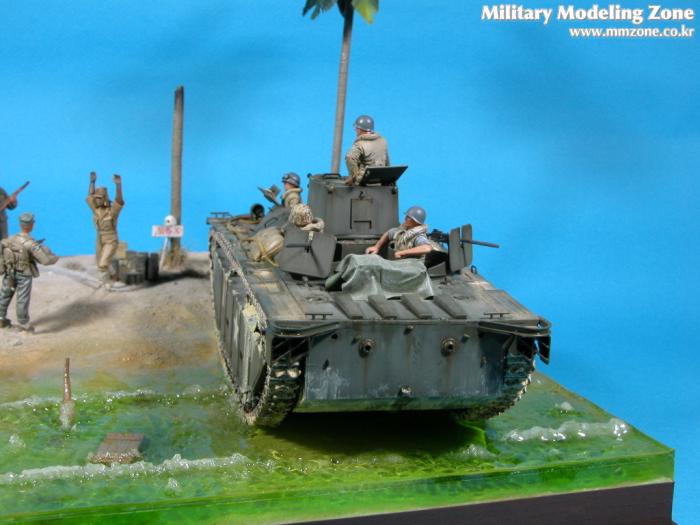 LVT(landing vehicle tracked)의 개념이 처음으로 등장하는 타라와 전투를 설정해 봤습니다. 태평양 전투는 여타 전선보다 치열하고 처절했습니다만 모형의 소재로는 별로 인기가 없는 것 같습니다. (독일군이 없어서 그런가요?) 희소성이 있어 제작했습니다만 넓은 장소를 채울 길이 없어 썰렁하기만 하네요. 물 표현에 대한 경험을 했다는데 의의가 있어서 만족합니다.
