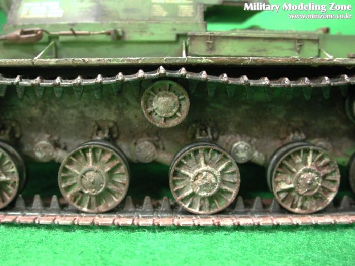 측면사진입니다 차체 하부에 진흙표현이 어색하네요 캐터필러 안쪽의 로드휠부분은 연필심으로 표현하였습니다 그런데 이상하게 고무트랙을 표현한것같군요 로드휠의 접지면도 같은 방식.....