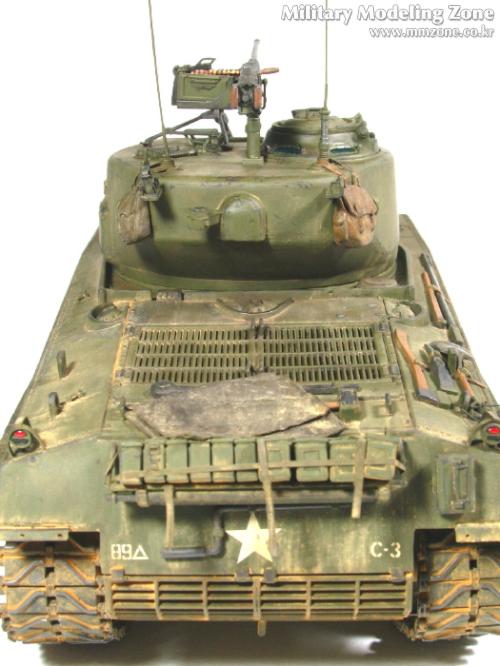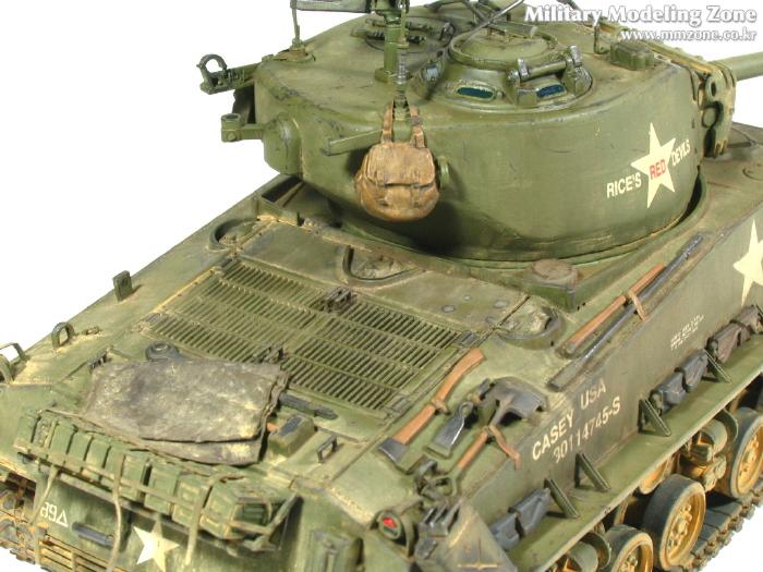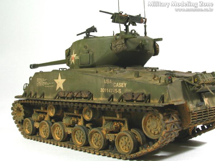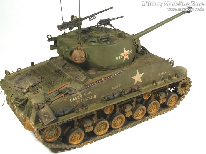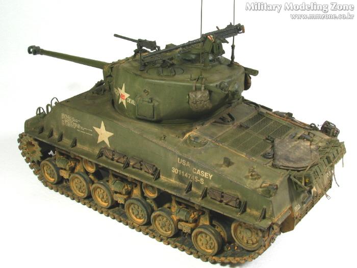잘 아시는 M4A3E8 '이지 에잇'입니다. 드래곤 1/35 한국전 사양이고, 궤도는 AFV 걸로 바꾸었습니다. 전차장 큐폴라는 아카데미 M4A2 76mm 에서 이식했고(후회됨,,있는거쓸걸) 장전수석 스프링은 아카데미 슈퍼셔먼에서, 기관총도 아카데미, 포방패의 디테일은 자료와 아카데미 M4A2 76mm 를 참조해서 조금 공사를 했습니다.