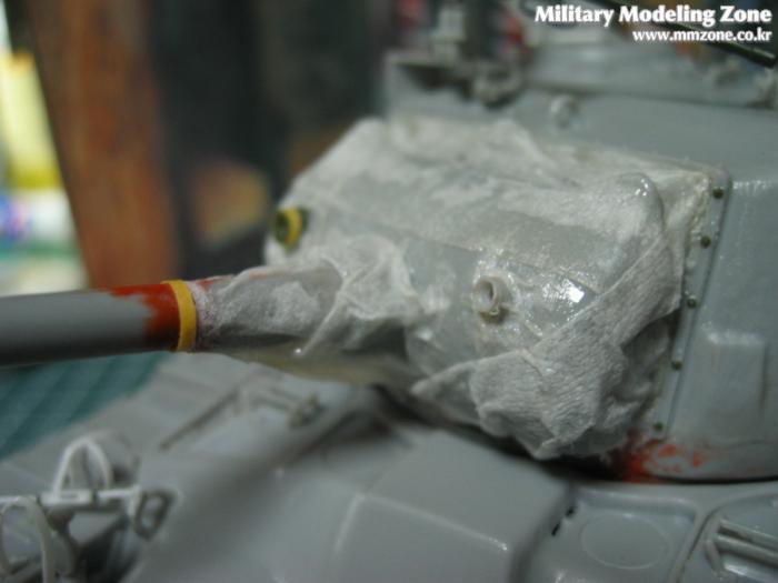 포 방수포는 냅킨을 이용해서 실제 천 같은 느낌을 주려 했는데 조금 모자란 듯 합니다. 키트의 궤도를 그냥 사용했고 가이드핀에 구멍뚫었습니다(네오의 안치홍님 제작기(M4A3E8 105mm)를 따라서).