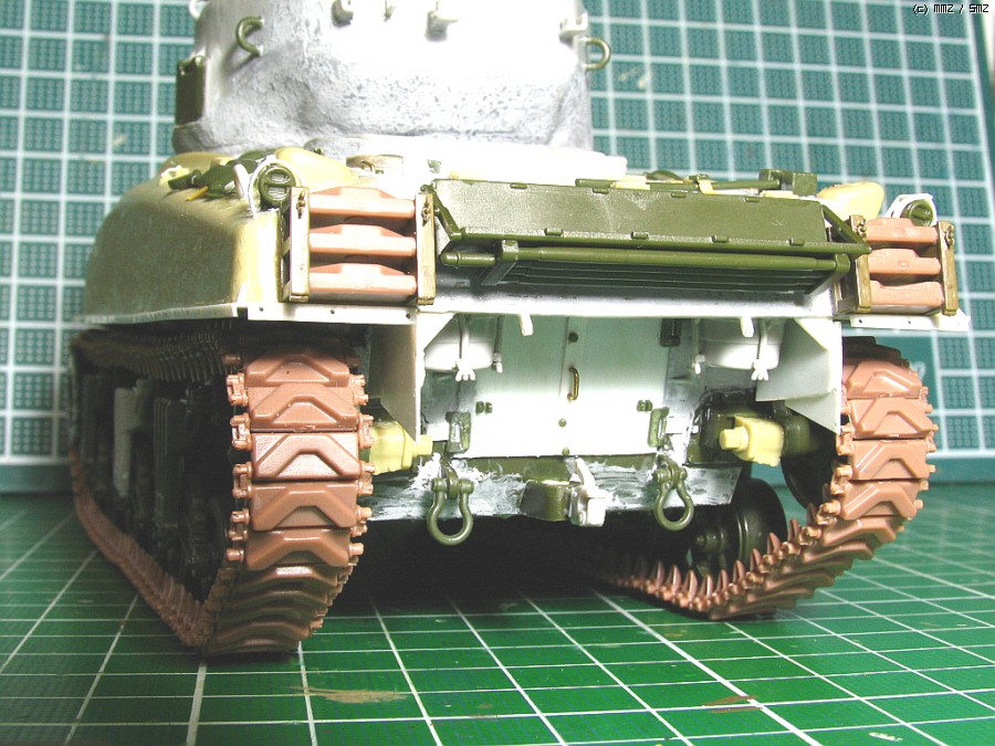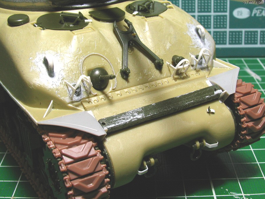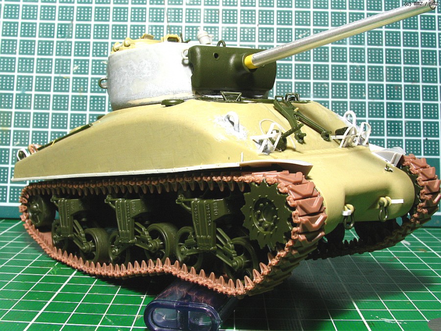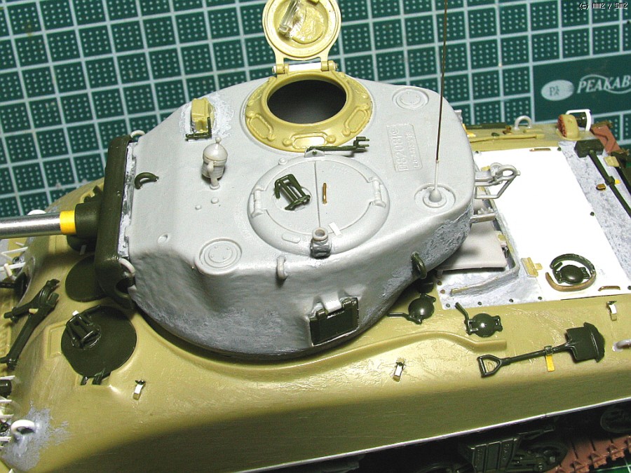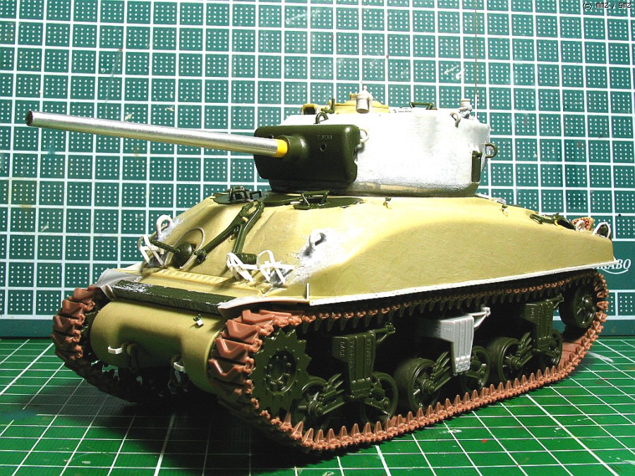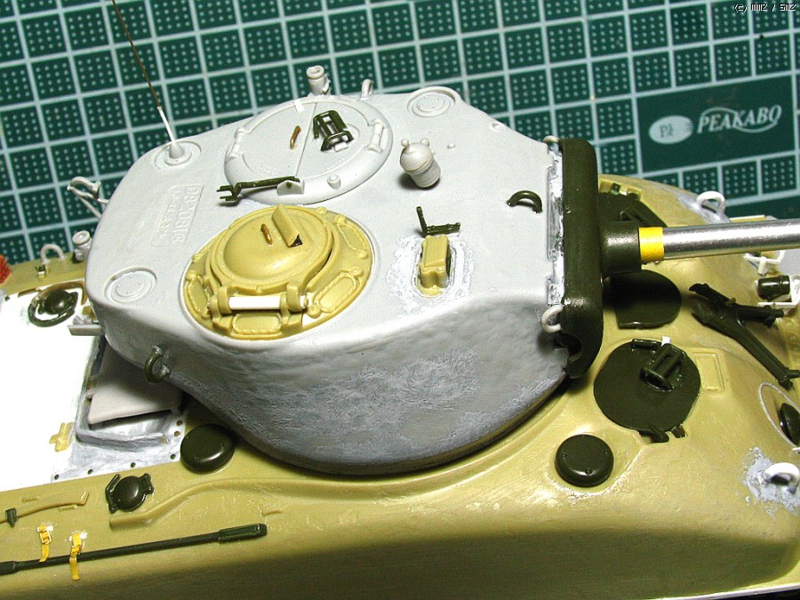 포탑 상부는 드래곤에서 가져왔고, 하부와 포방패부분은 아카데미 M4A2의 것입니다. 크기가 서로 맞지않아서,에폭시 퍼티를 이용해서 억지로 맞추었습니다.76mm 포탑의 초기형으로만들려다보니 어쩔 수 없네요...포탑후부의 예비총열걸이와 환풍기도 초기형 버전으로 변화를 주었습니다(재밌으라고...^^).