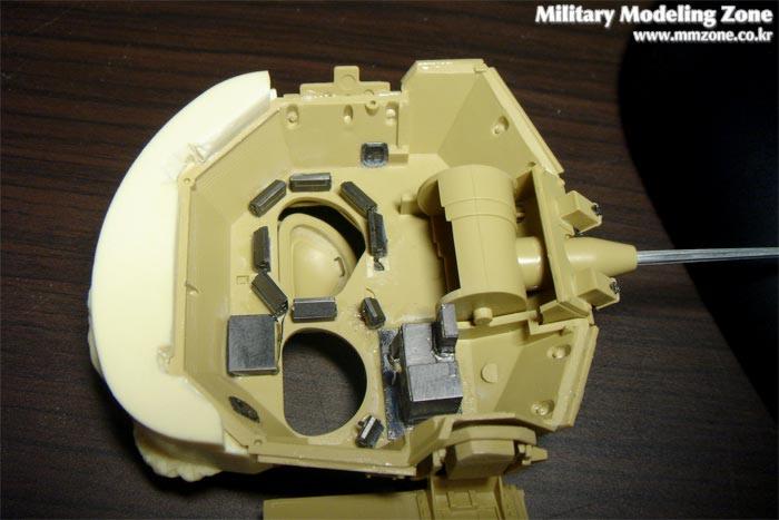 풀샷인데, 이전에 올리던 사진들과 크게 달라보이지 않습니다. (도대체 최근엔 열심히 작업하긴 하는것 같은데 뭐가 달라졌나 하는 생각이 들 정도입니다) 포탑의 발연탄 발사기 끝의 형태를 보면 기존의 키트의 모습은 약간 원뿔의 형태를 하고 있는 반면 최근의 사진들을 보니 이전의 단순한 고무커버형식으로부터 조금 더 개량된 형태 (밝은 녹색/에머랄드색의 커버)로 된 것들도 있고 또 쉽게말해서 둥그런 발연탄이 발사되는 관에 고무커버를 씌워놓은 것이다 보니 어쨌든 원래 모양과 좀 다르겠다 싶어서 2mm 핀바이스로 살살 들어가게 수정을 해주었습니다.