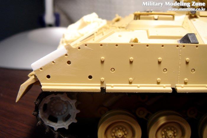 타미야의 예전M2A2 IFV도 마찬가지고 실차사진을 보니 M2A2의 초기모델들의 특징으로 보여지는 사진의 흰색부분의 누락(?)으로 1.2mm 플라판을 적절히 재단하여 단단히 붙이고 줄과 사포로 다듬어 일직선을 만들었습니다. 저 부분은 이번에 아카데미의 신제품에서 제대로 개선이 되어 무척 반가운 부분입니다.