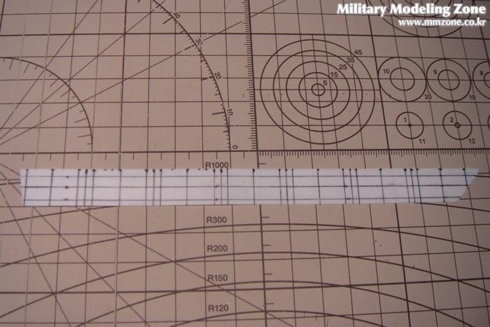 우선 일반적인 타미야의 차체파트의 두꼐는 1.2mm 인것을 감안하여 실차사진과 열심히 대조를 해본 결과 (눈대중으로 실천할 수 있는 범위가) 0.3mm 의 프라판 두장 사이에 0.5mm 의 스페이서가 들어가면 알맞는 사이즈가 될 것 같았습니다. 며칠전에 산 스틸자로 정밀하게 사이즈를 재서 오려낸 4장의 0.3mm 사이드스커트에 서로 대칭의 2장에는 원래의 너트의 위치를 계산하여 밑줄을 긋습니다. 이때 4장의 프라판은 앞으로 접착도 서로 잘되고 또 알맞은것을 찾다가 집사람이 권해준 0.3mm 사인펜이 손자국에 지워지지 않도록 프라판을 사포로 곱게 갈아두니 작업이 아주 편했습니다.