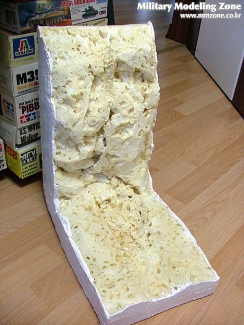 우레탄폼을 쏜뒤 건조시킨후, 커터칼로 깎아서 대강의 계곡모양을 잡습니다. 양옆쪽과 앞쪽의 절단면은 지코트 베이스로 마감했습니다.