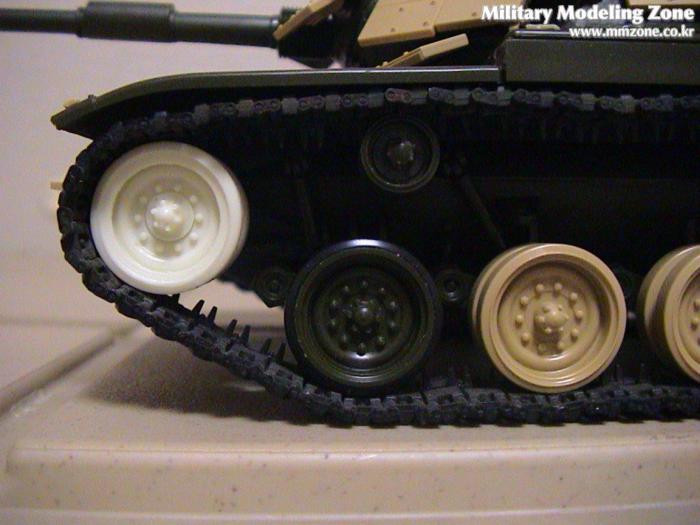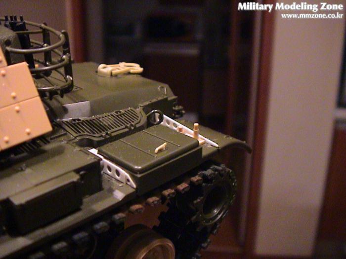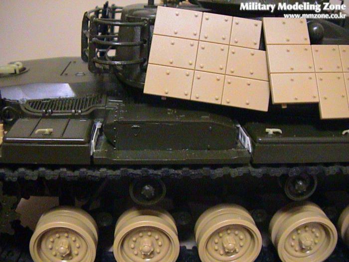 아카데미 키트에 타미야 반응장갑 및 바퀴, 레전드 바퀴, 아카데미 바퀴, AFV 클럽 캐터필러를 사용했고 펜더 서포트는 플라스틱판으로 모두 만들었습니다. 차체 앞 운전석 근처 각이 진 곳들은 둥글게 만들어 주었고 라이트 가드 지지대도 만들었습니다.
