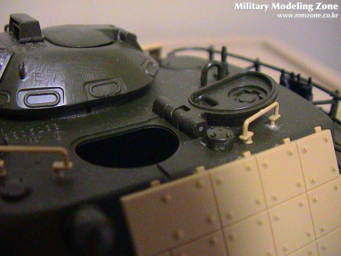 아카데미와 타미야 키트에 빠져 있는 라이트가드 지지대를 만들어 주었고 운전석 오른쪽 앞 회색으로 보이는 돌출물도 만들어 주었습니다. 타미야 반응장갑판을 있는 그대로 붙여주면 라이트가드 지지대 붙일 공간이 없습니다. 사진에서 왼쪽 라이트 뒷 부분 반응장갑판을 잘라낸 뒤 약간 뒤로 옮겨 붙여 준 뒤 라이트가드 지지대를 붙여 주었습니다. 운적석 잠망경은 다른 아카데미 키트에 있는 것을 가져와 3개 만들어 주었습니다.