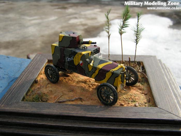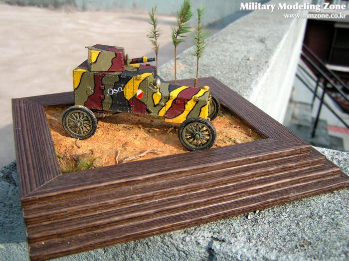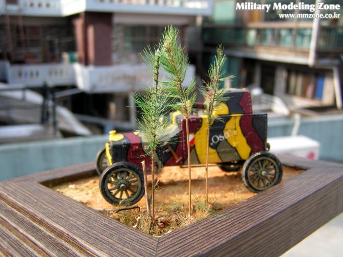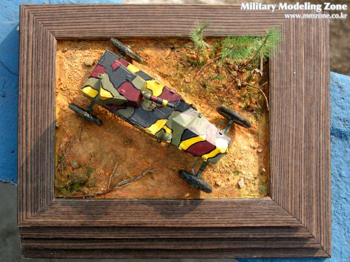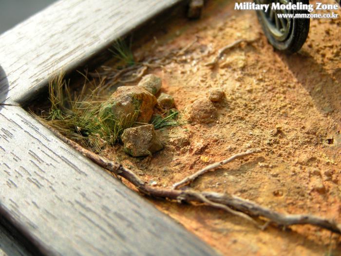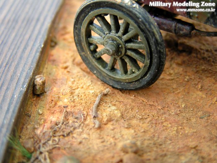 땅에 바퀴자국은 선명하지 않도록 했습니다. 이 차의 무게는 잘 모릅니다만 얼핏 보아 가벼워보이고 이미 굳어진 땅처럼 보이게 하고 싶었습니다. 모델링 페이스트가 마른 후에 바퀴자국 주변으로 균열이 가도록 해서 굳어진 흙이 갈라진 표현을 해줬습니다.