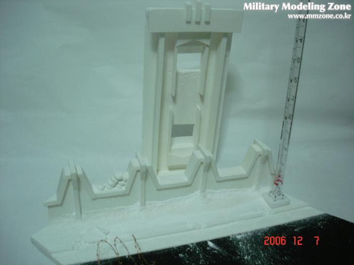 담벼락과 인도, 건물등은 우드락으로 제작, 모래주머니는 화방지점토로 제작하였습니다,