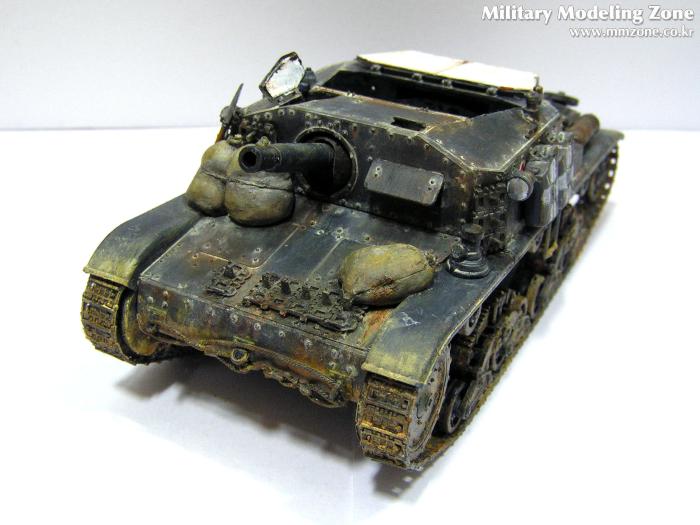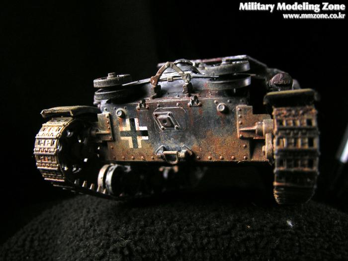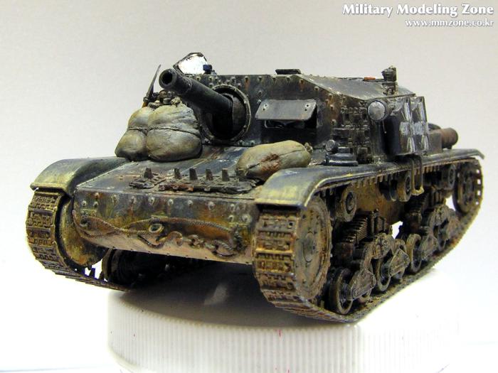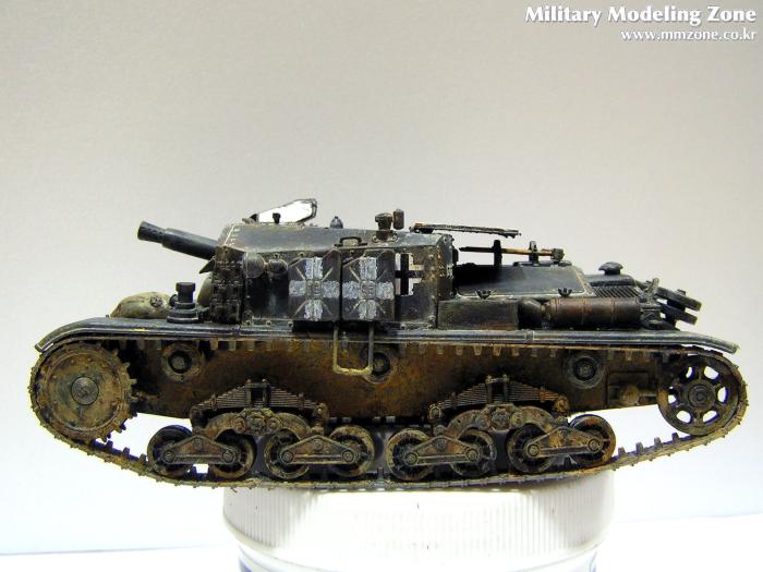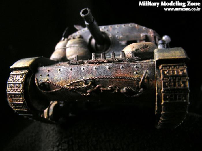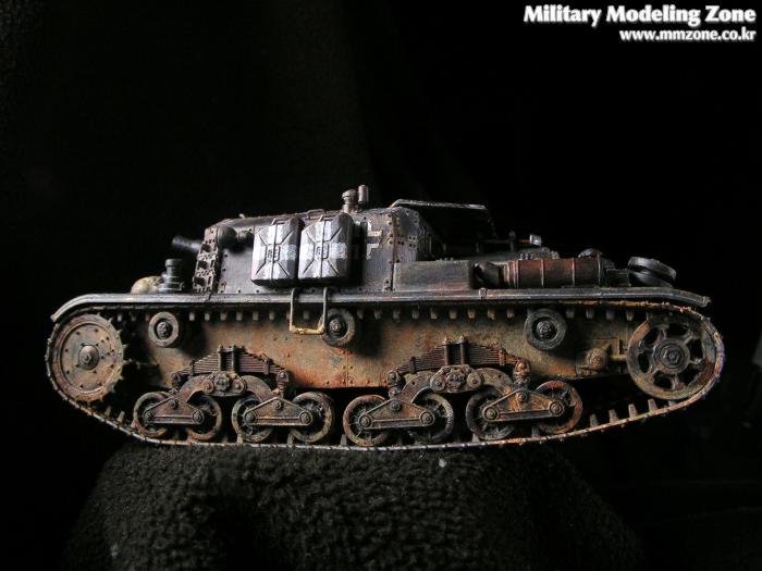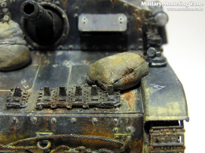 앞쪽 하부도 제가 조금 만족스러워하는 부분입니다. 사진상으로는 색이 튀지만 실제로는 사진보다는 자연스럽습니다. 주조질감 및 녹슨 표현을 위해서 모델링 페이스트를 두드려 바른 후에 기본도색을 하였고, 녹슨 표현과 먼지표현을 위해서 주로 옐로우 오크와 번트시에나에 무채색 계열을 섞어 조색해서 수차례 발랐습니다. 그런데 연질 캐터필러의 지느러미는 너무 눈에 띄네요. 나중에 알았지만 탱크에 붙이기 전에 날카로운 칼로 적당히 다듬은 다음에 라이타불로 살짝 데워주면 쪼그라들어서 잘 안보이게 되던데.. 이미 순접으로 붙여놓은거라 뗄 엄두가 나지 않았습니다.
