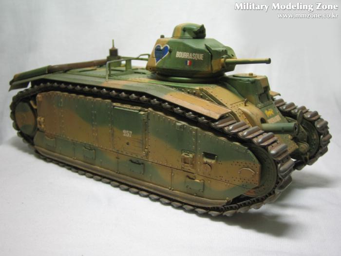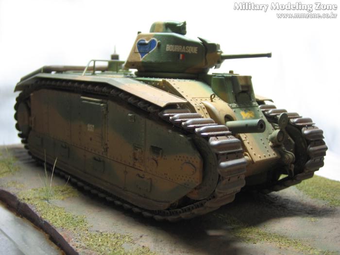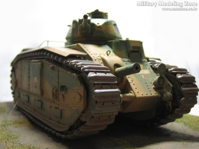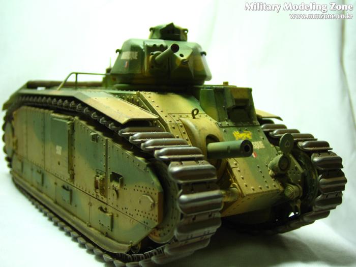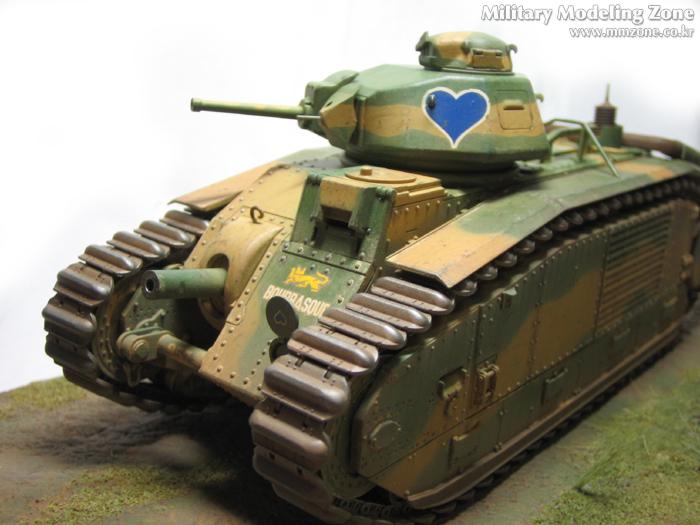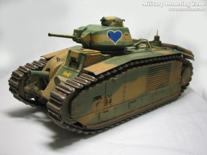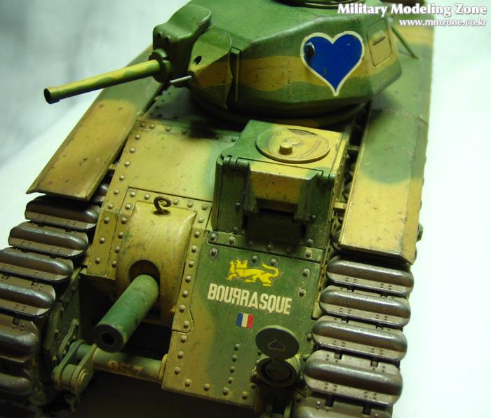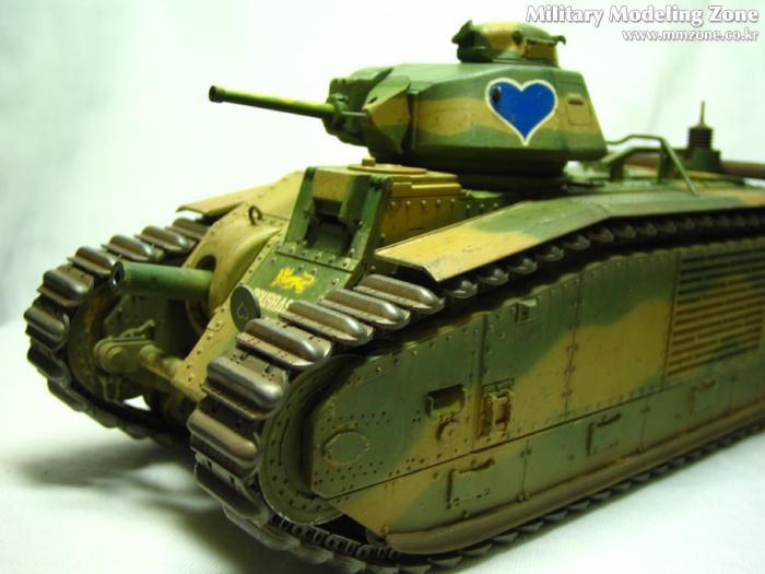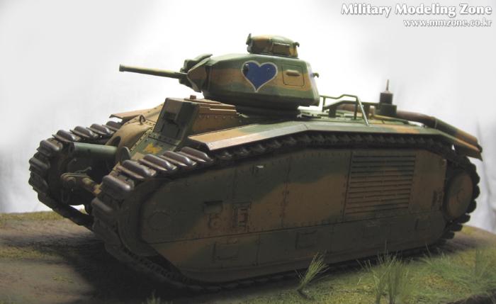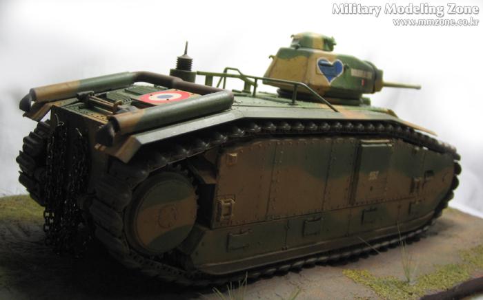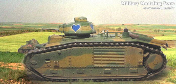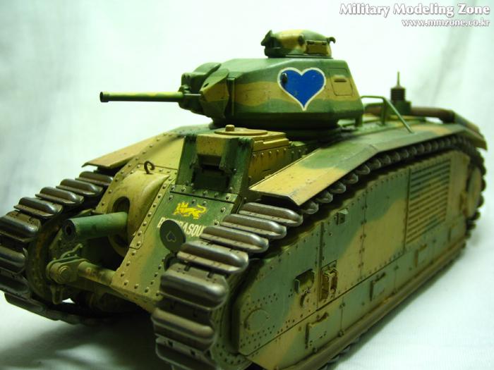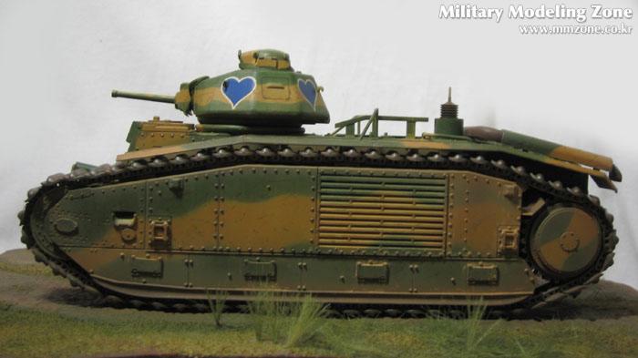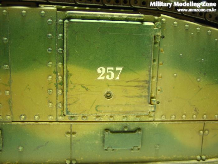 실전 경험을 쌓기도 전에 궤멸되어 버린 프랑스군인지라 독일군 전차들 처럼 녹 표현이나 까기를 심하게 할 수는 없을 것 같고, 그렇다고 이렇게 덩치가 큰 전차를 깨끗하게 완성 시킬 수도 없을 것 같아 그린 바탕에서는 녹+까기를 카키 계열에서는 살짝 바탕색이 드러나는 정도로 해 주었습니다.
