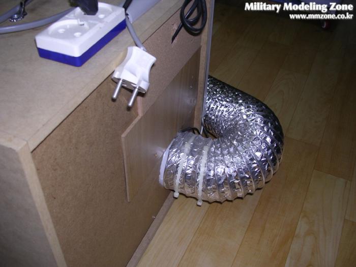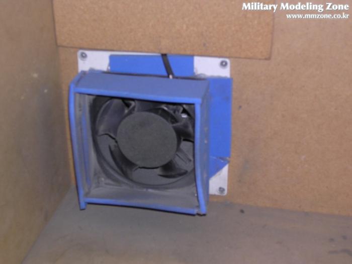 처음에는 화장실 천장용 환기팬을 사용했는데 뽑아내는 힘이 약해서 어떤 좋은분께 공짜로 강력한 팬을 선물 받아 추가 작업을 해서 달았습니다. 그런데 너무 팬이 강력하다 보니 와류 현상이 발생하여 보강 작업을 하니 훨씬 덜 하더군요.