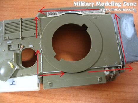 전차병2,3 - 다리부분 때문에 포탑에 들어가지가 않아서 불에 달군 칼로 다리를 쓱~ 잘라버렸습니다. 또 불필요한 몰드도 칼로 쓱~ 밀어버렸습니다.