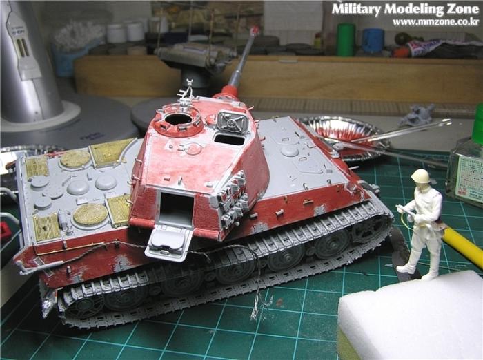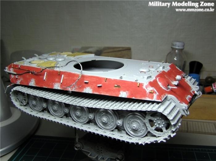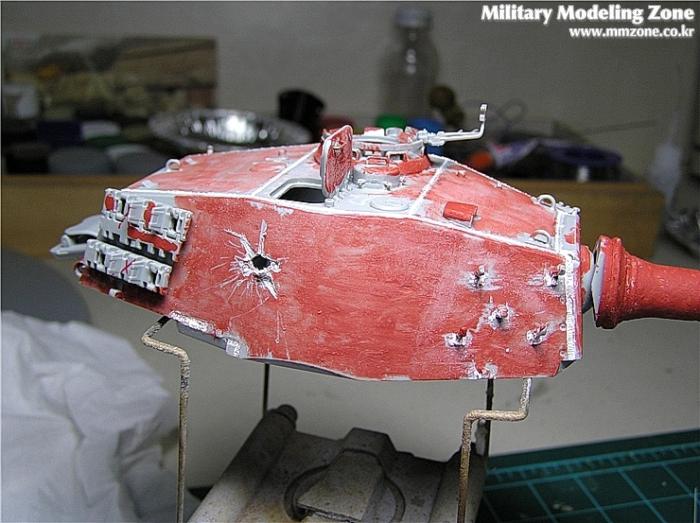 버려진 전차의 컨셉에 따라 도색도 아주 하드한(올여름에 휴가를 제대로 못가서 분풀이를^^;ㅎㅎ) 웨더링이 들어갈 예정이라서 차체의 질감도 좀 과할정도로 표현해주었습니다, 주재료는 그라인더와 레드퍼티... 키트에 몰드되어 있는 용접선도 표현이 일률적이거나 깊이가 약해서 0.3mm플라봉으로 다시 만들어 주었습니다.