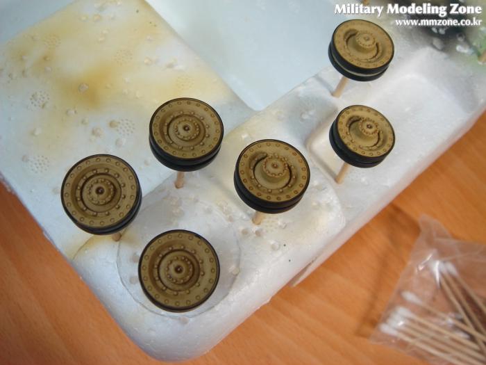 로드휠도 워싱을 해준 뒤, 타미야 에너멜 XF-1로 rubber rim을 칠해줬습니다.