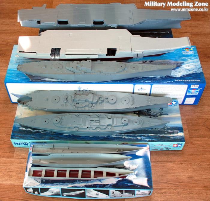위부터 Tamiya USS Enterprise, Trumpeter Admiral Kuznetsov, Tamiya USS New Jersey, Tamiya Yamato, Academy Bismarck, MiniHobbyModels USS Ticonderoga, Dragon USS Momsen, Trumpeter Sovremenny 입니다...