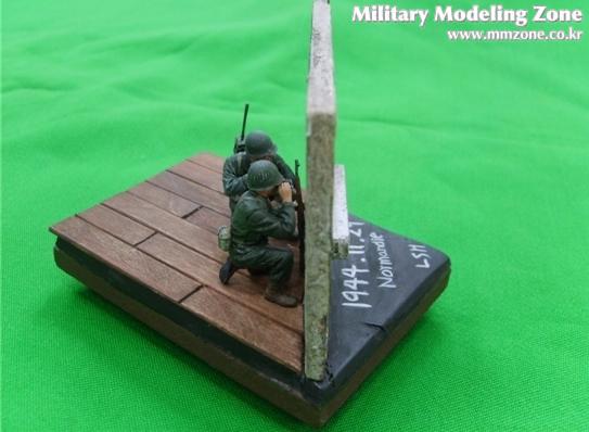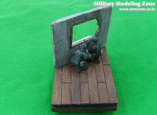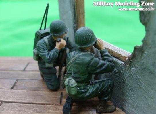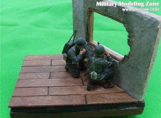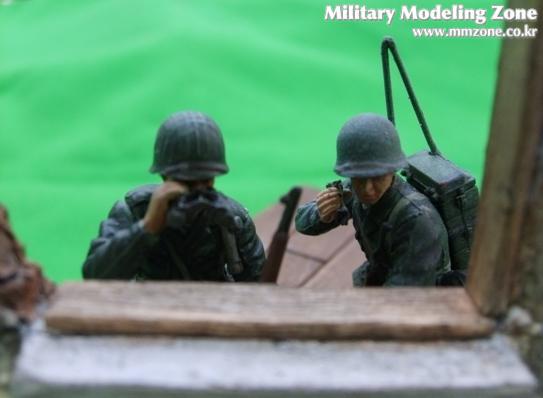 무전병과 관측병이 건물에서 독일군쪽을 바라보며