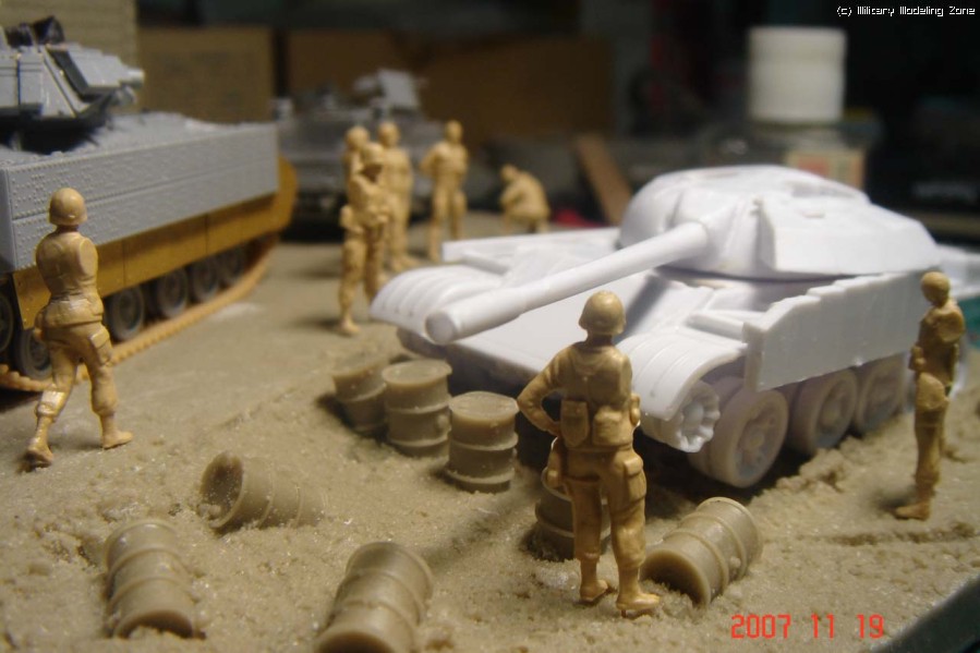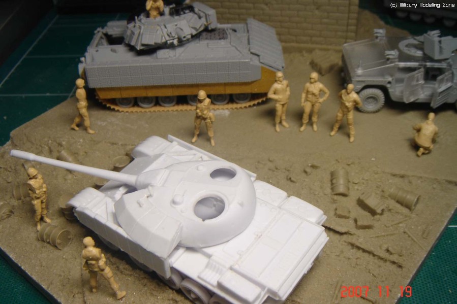 일단 인형들은 0.5mm 핀바이스로 발밑에 구멍을 뚫고 황동선을 박아 고정시켰습니다. T-55는 사진을 보니 꽤 그럴싸하게 보이지만 깎고 다음어야 하는 중노동의 물건이었습니다. 차라리 에칭작업을 병행하고 있는 브래들리가 훨씬 나을듯.