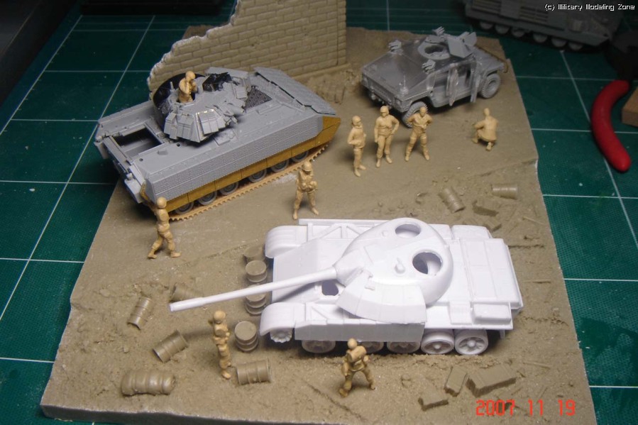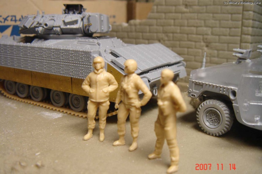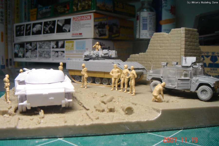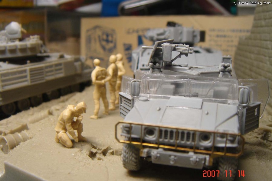 전체적으로 이런 앵글을 생각하고 있습니다. (이니그마가 반대쪽을 보고 있을 수도 있구요). 험비와 브래들리에서 병사들이 모두 나와있는 설정인데, 프라이저의 인형들은 아직 숫적으로는 여유가 있긴 하지만 설정에 알맞는 포즈가 자유롭지 않아서 일단 저정도의 인원만 차출(?)이 되었습니다.
