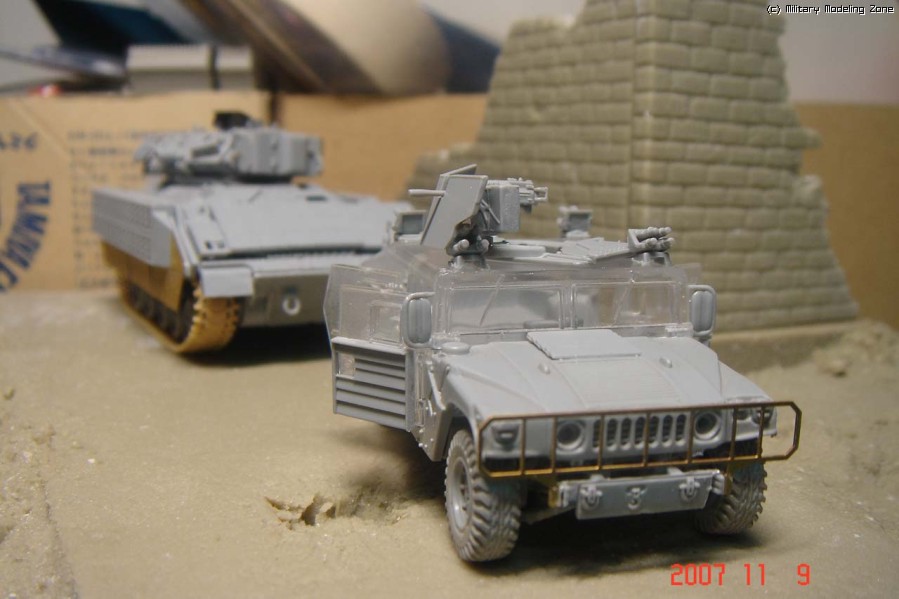 카메라가 좋지 않아서 더 좋은 앵글을 찍기는 어렵겠지만 이니그마의 작업이 시작되기 전에 예전에 조립만 해두었던 브래들리를 그자리에 메꾸고 찍었던 사진입니다. 험비가 호송을 하고 있는 브래들리가 파괴된 이니그마 앞에 멈춰서서 잠시 확인하는 장면을 소재로 삼았습니다.