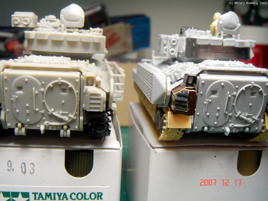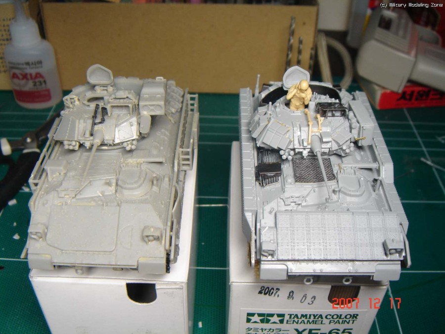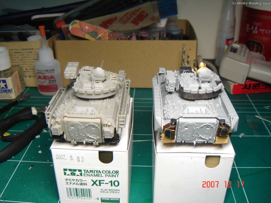 왼쪽은 같은 베이스의 키트인 M2A2 Bradley 2004 입니다. 2년여전에 설명서 그대로 만들어서 비교적 무관심 속에 방치되었더니 약간 색이 변했습니다.