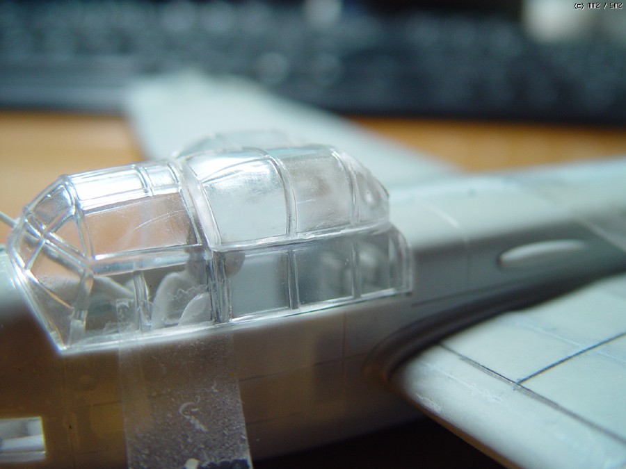 그러나 가장 절망적인 건 캐노피가 2~3mm쯤 짧은 느낌이 든다는 것. 정확히 비교를 해본 건 아니지만 느낌이 너무 짤땅막하고 후부 총좌가 너무 불룩 튀어 나왔다. 그 때문인지 후방 총좌쪽 방탄판의 경사가 너무 가파라서 실루엣이 전혀 Ju88스럽지 않아 약간이나마 비슷하게 만들기 위해 캐노피 후방의 모서리를 깍고 방탄판의 아래부분에 에폭시를 발라 경사진 것 처럼 보이게 해줬다.