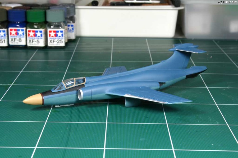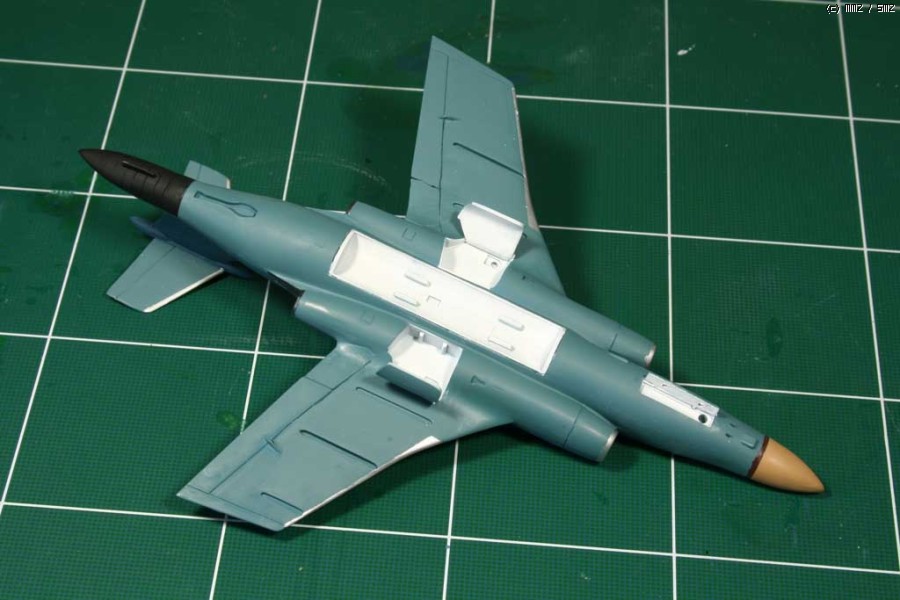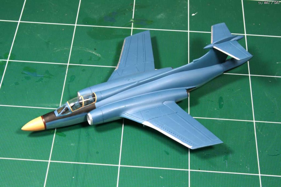 상면은 XF-18 미디움그래이에 블루를 적당히 섞었고 하면은 그린을 소량 섞어서 사용했습니다. 나머지 부분은 마스킹을 해서 도색. 특히 캐노피 부분은 2중 마스킹으로 노즈콘과 같은 색으로 투톤으로 칠해주었다. 먹선을 넣기와 데칼링을 위해 락카클리어를 뿌려줄 계획인데 한번도 에나멜위에 뿌려 본적이 없어서 조금 걱정은 된다. 노하우를 갖고 계신분을 좀 알려주세요.