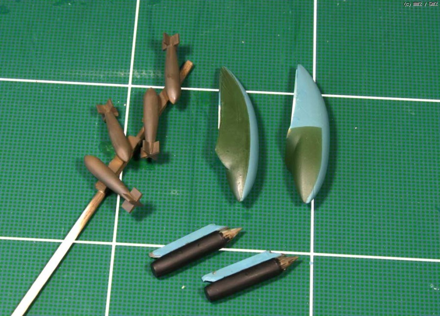 전부 타미야 에나멜을 사용했는데 이유는 타미야 에나멜이 가장 많이 갖고 있는 페인트 입니다. 단순한것 같은데도 마스킹을 상당히 많이 했습니다. 이틀 걸렸습니다. 연료탱크는 모양이 특하게 생겼고 도색도 특이합니다. 공군버전이라 통상 폭탄과 로켓런처, 연료탱크를 선택했습니다.