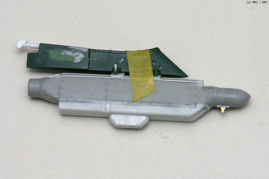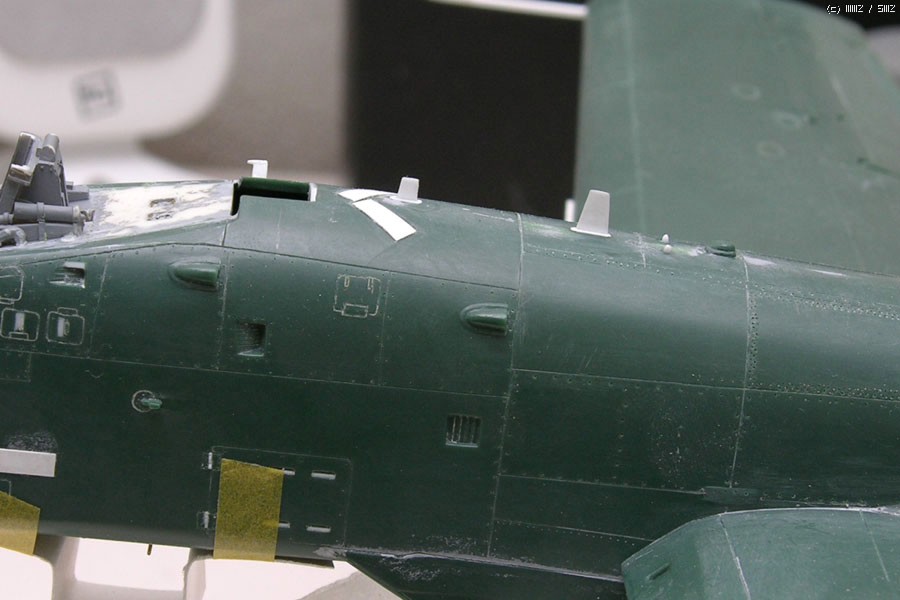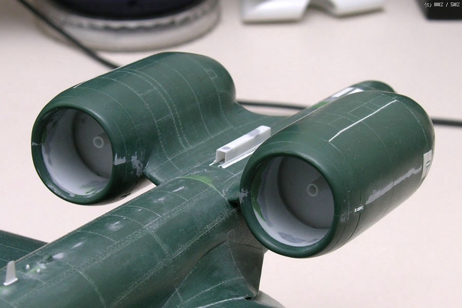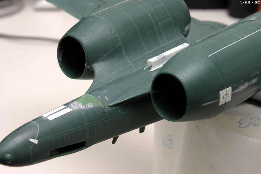 기체 꼬리부분의 작은 안테나 2개는 제품에 재현이 않되어 작업해 주었고, 꼬리끝에 마름모 모양의 돌기물이 또 있는데 실기체에는 없으므로 싹 밀어버렸습니다. 이부분은 이탈레리, 하비보스제품도 잘못 표현되어 있습니다.