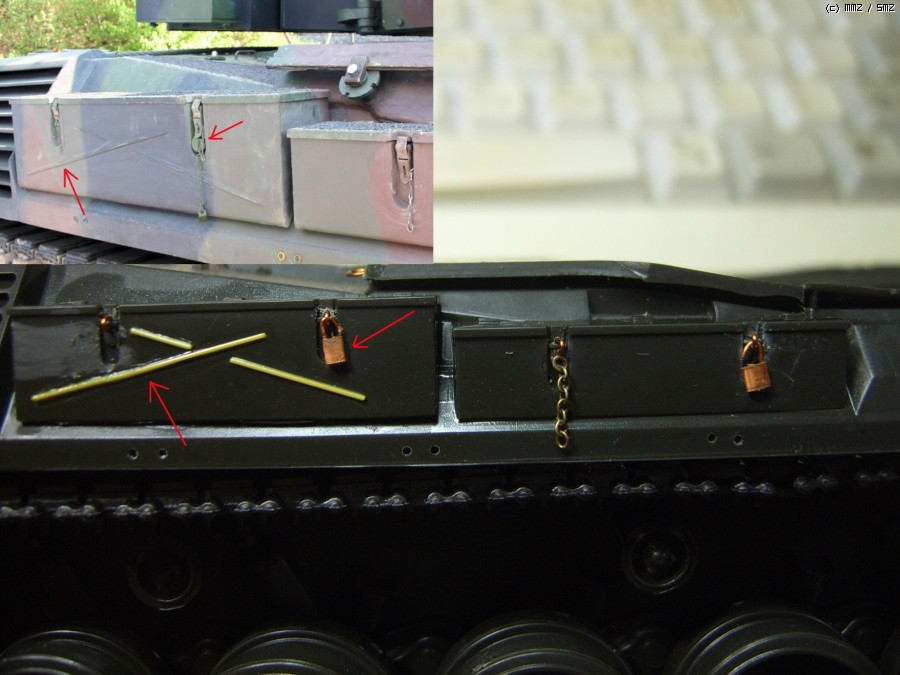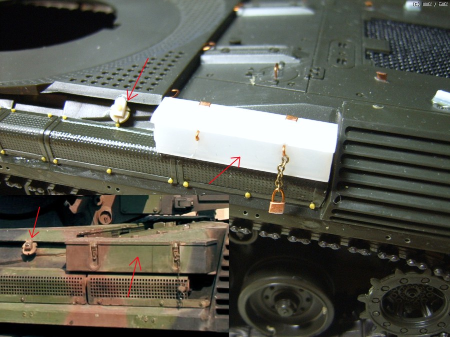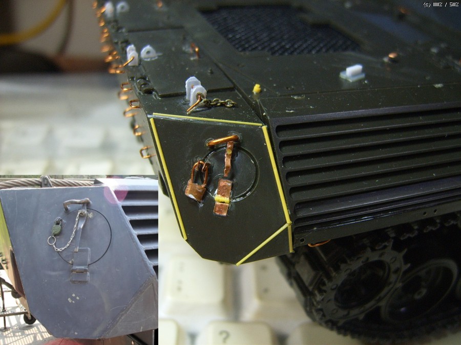 황동판과 구리선으로 자물쇠를 자작하고 가는 쇠사슬을 잘라 붙여주었습니다. 실물 사진에서 공구상자 근처에 자물쇠가 많더군요^^