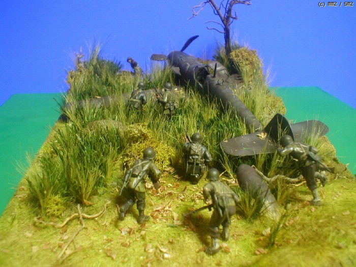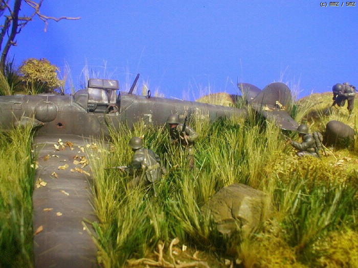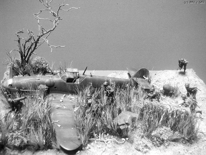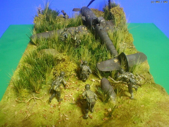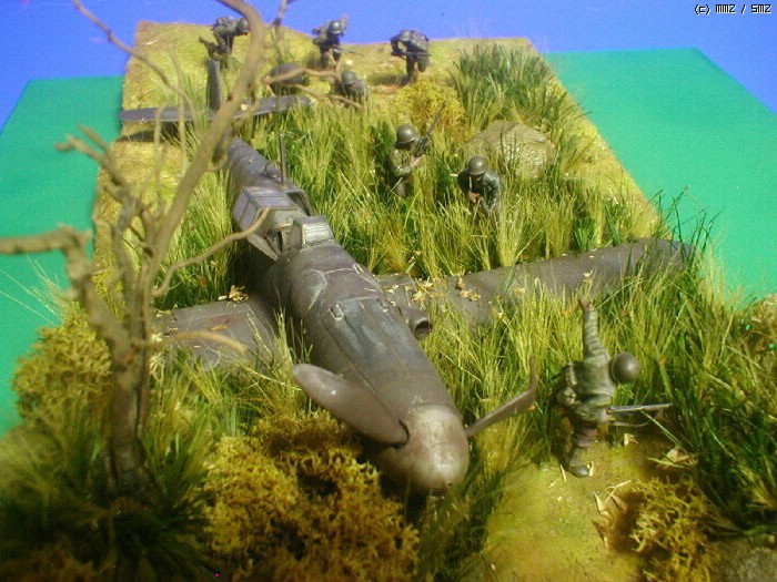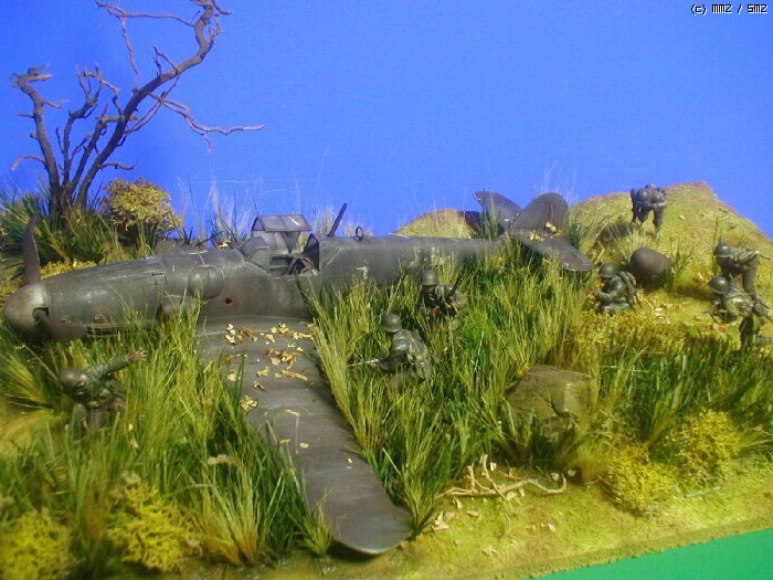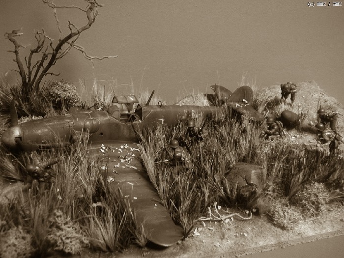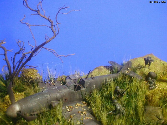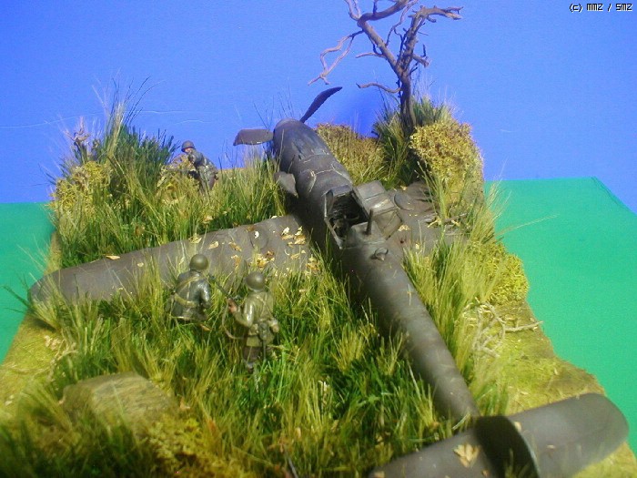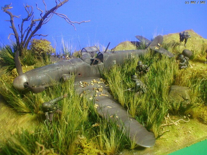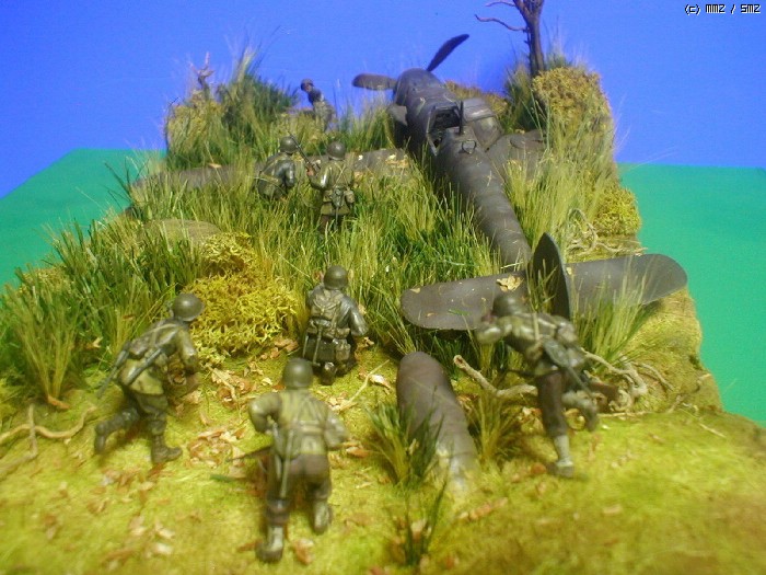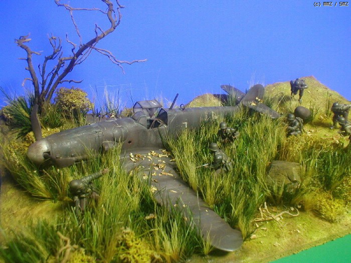 피겨는 타미야,뱅기는 부러져 뒹구는 아카제 bf-109 ,나무와 각종 풀은 키우는 화초에서 채취 하여 칼로 잘게 썰어 풀을 만들고 나무는 죽은 화초의 뿌리로 고목을 표현 해봤습니다. 그리고 돌은 아들녀석