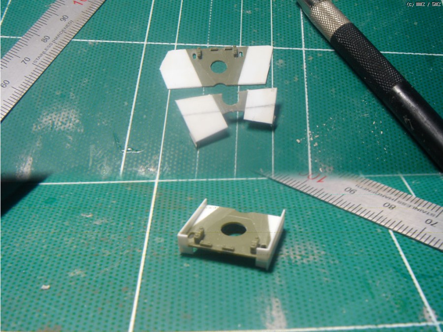 정확한 도면이 없어 포탑위에 샤프펜슬로 레이아웃을 그리면서 버니어캘리퍼스와 스틸자로 길이를 측정하여 별도의 그림을 그려보면서 작업했더니 쉽게 되었습니다. 집에 굴러다니는 M2사이드스커트부품에서 볼트너트등의 고정구를 포를 떠서 옮겨붙였고, 이 장갑판이 포탑에서 약간 떠 있는듯 해서 스페이서를 만들어붙였습니다.