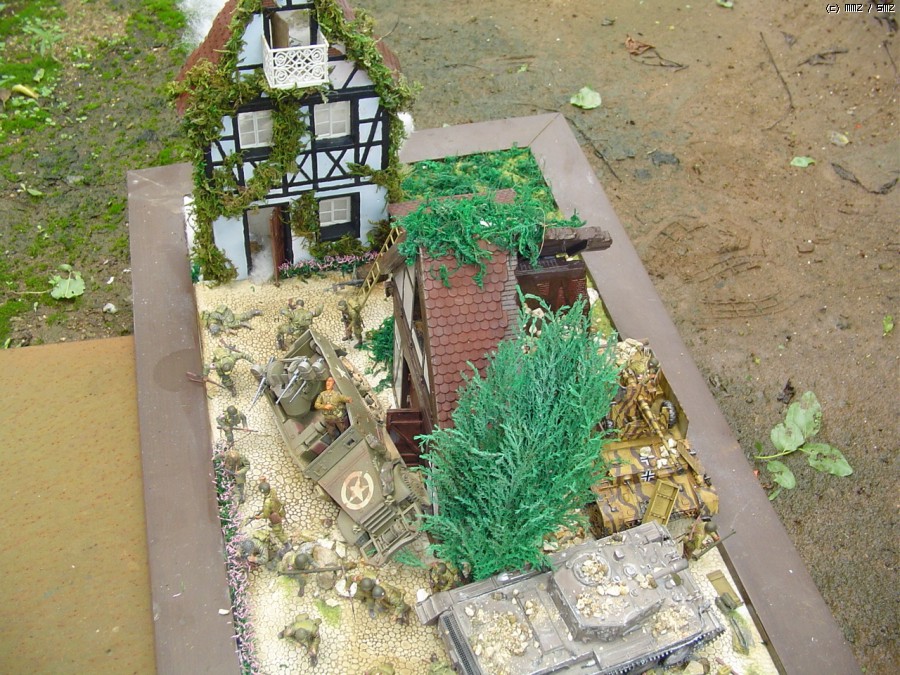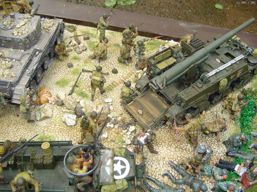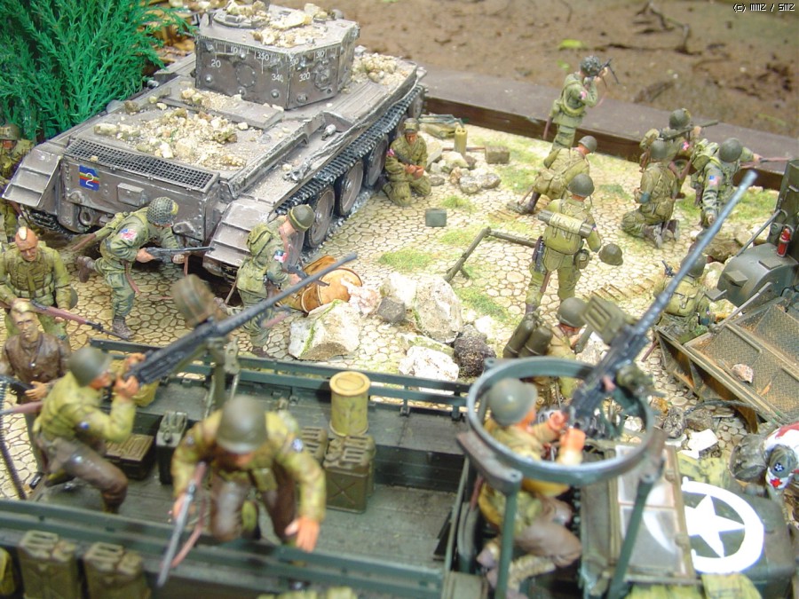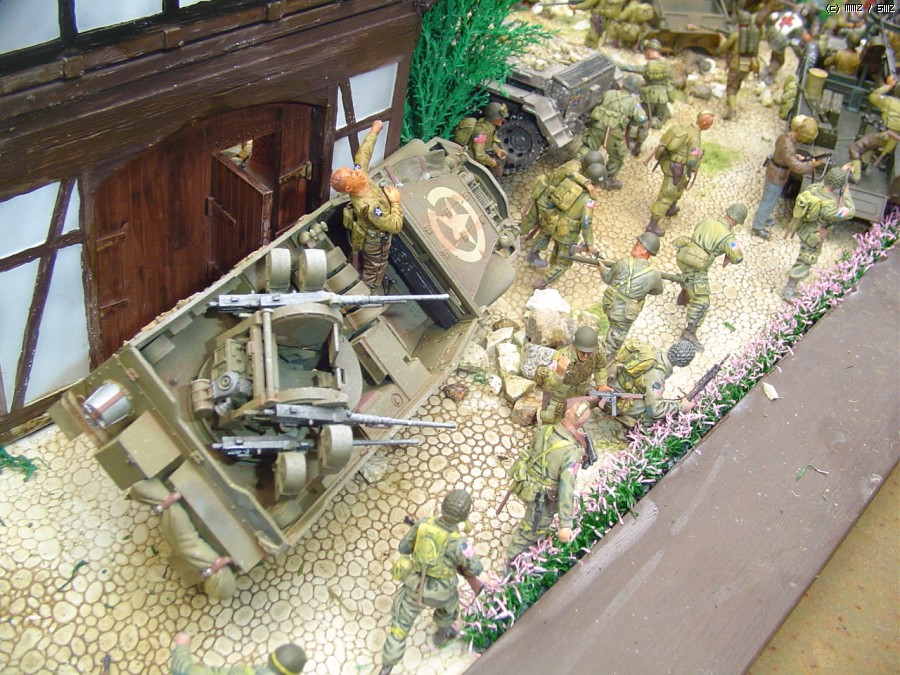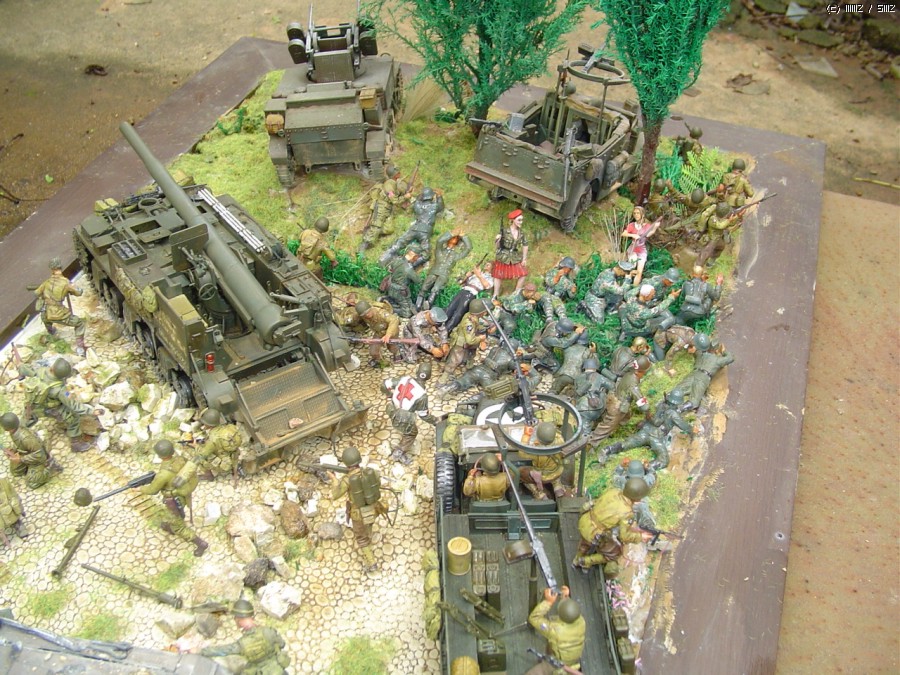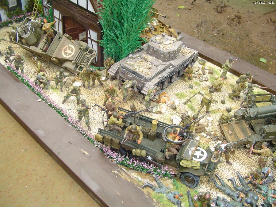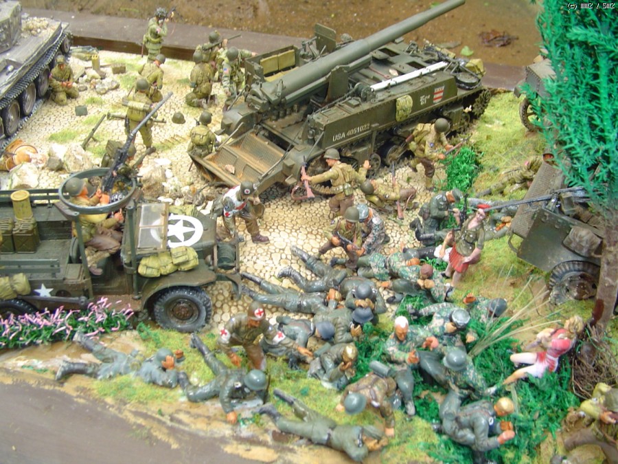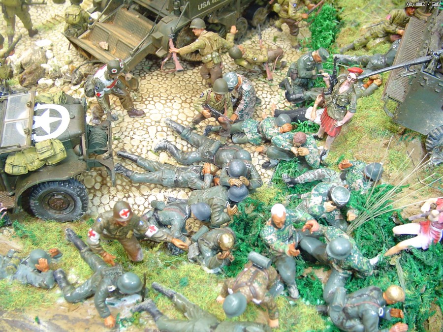 이번 디오라마는 미군이 네덜란드로 밀고 들어갔는데 독일군이 88미리로 공격해서 건물이 파괴되고 메서슈미츠가 공격하여 미군이 대공포를 쏘고 독일군 포로들이 총않맞으려고 땅에 납작 숙이고 레지스탕스들이 독일군을 감시하는 씬으로 햇습니다