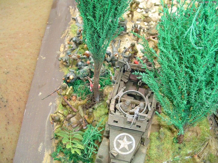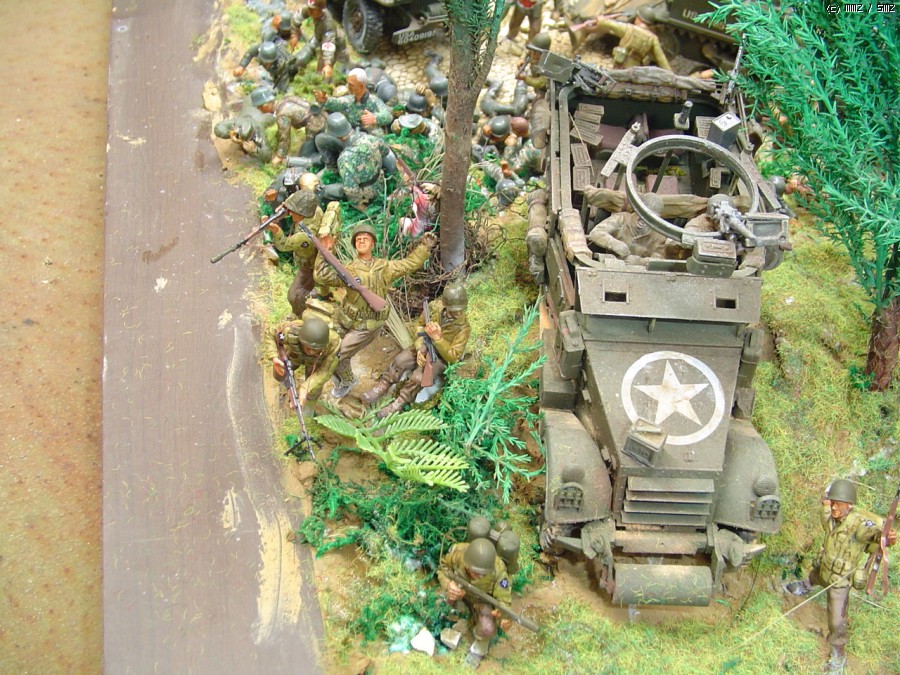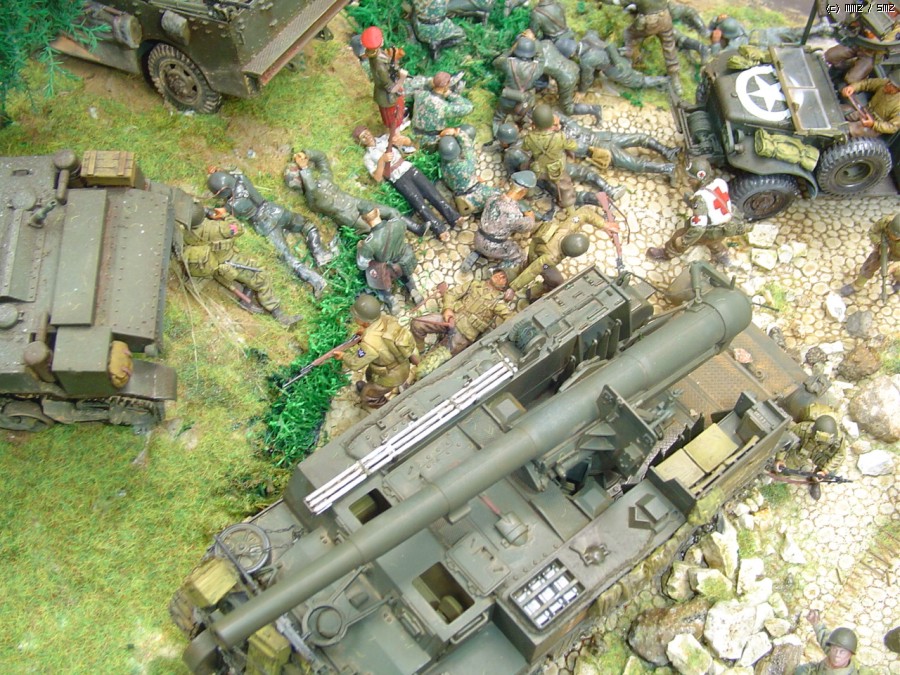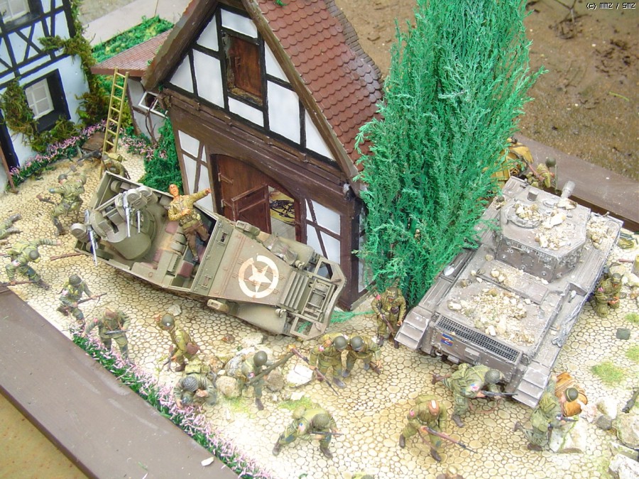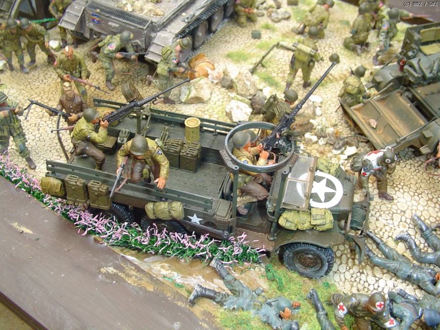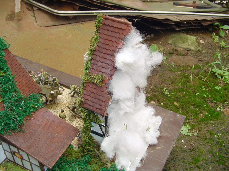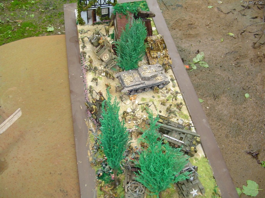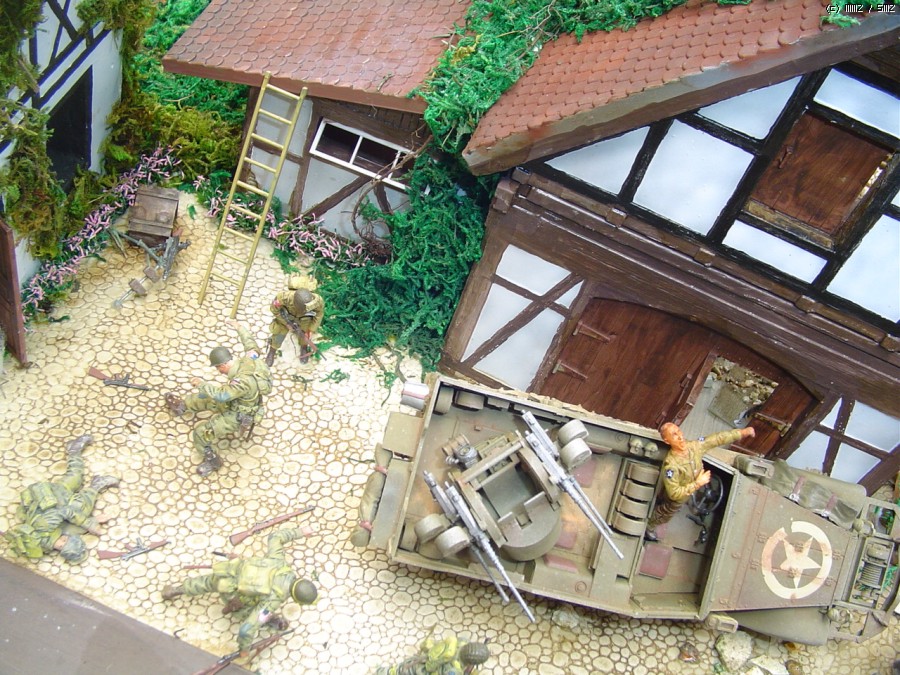 이번 디오라마는 미군이 네덜란드로 밀고 들어갔는데 독일군이 88미리로 공격해서 건물이 파괴되고 메서슈미츠가 공격하여 미군이 대공포를 쏘고 독일군 포로들이 총않맞으려고 땅에 납작 숙이고 레지스탕스들이 독일군을 감시하는 씬으로 햇습니다