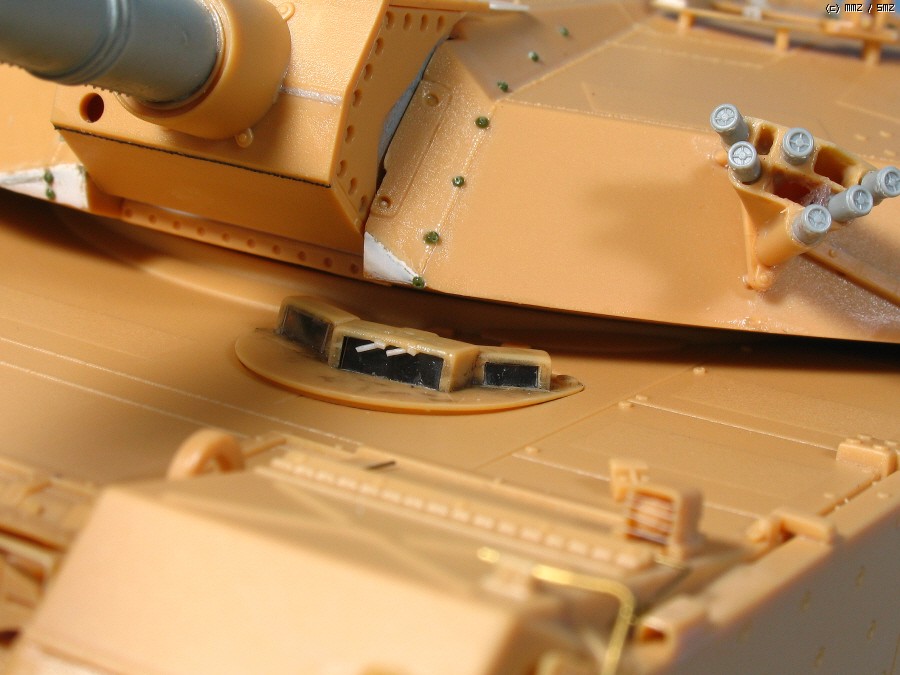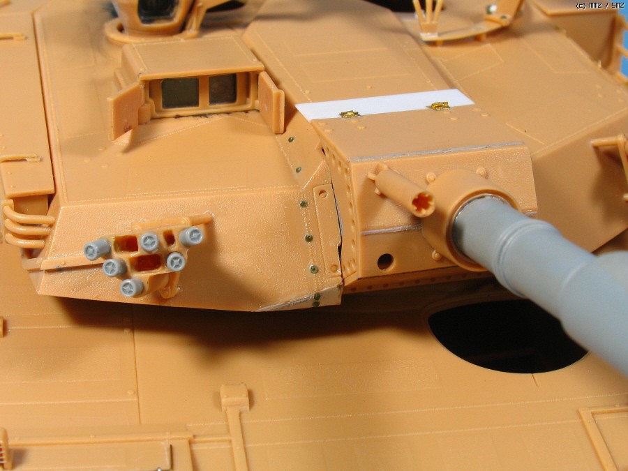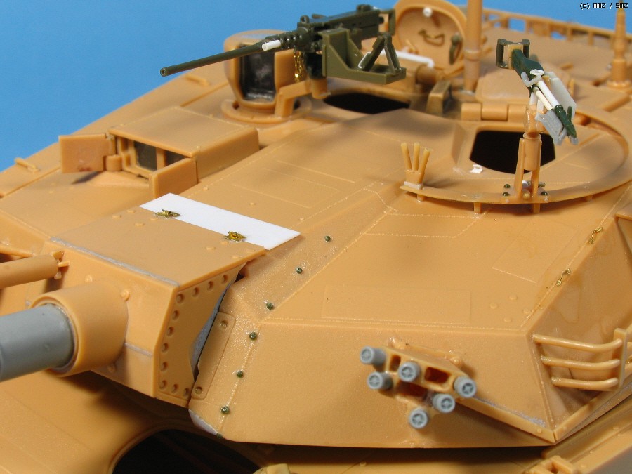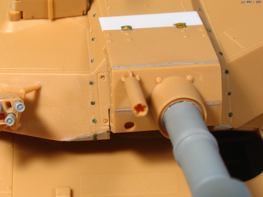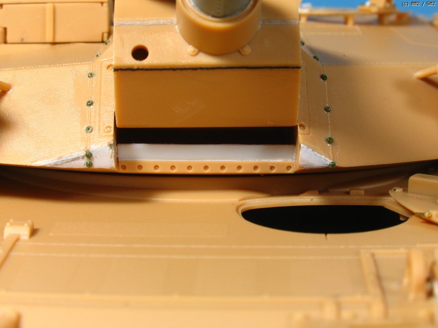 포방패 옆의 녹색 점모양은 한정판에 에칭으로 들어 있는 볼트로 저는 다른 키트에서 따왔고,가운데에 송곳으로 찍어서 모양만 냈습니다. K1에는 이부분이 없는 전차도 있지만 K1A1에는 예외가 없더군요.