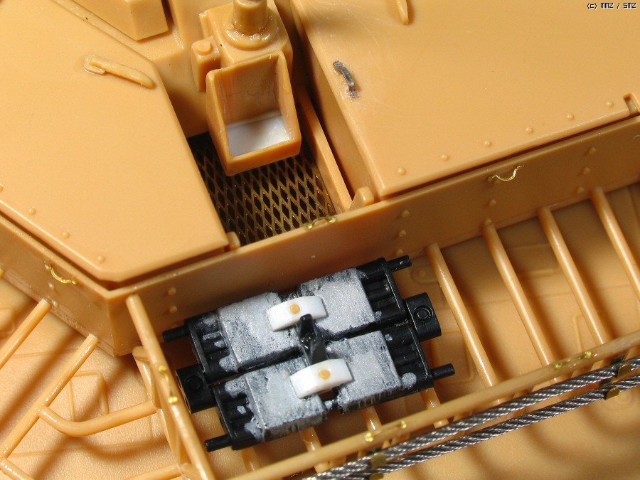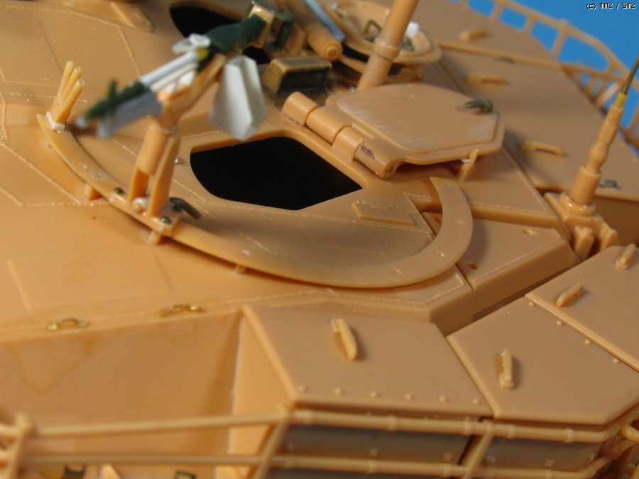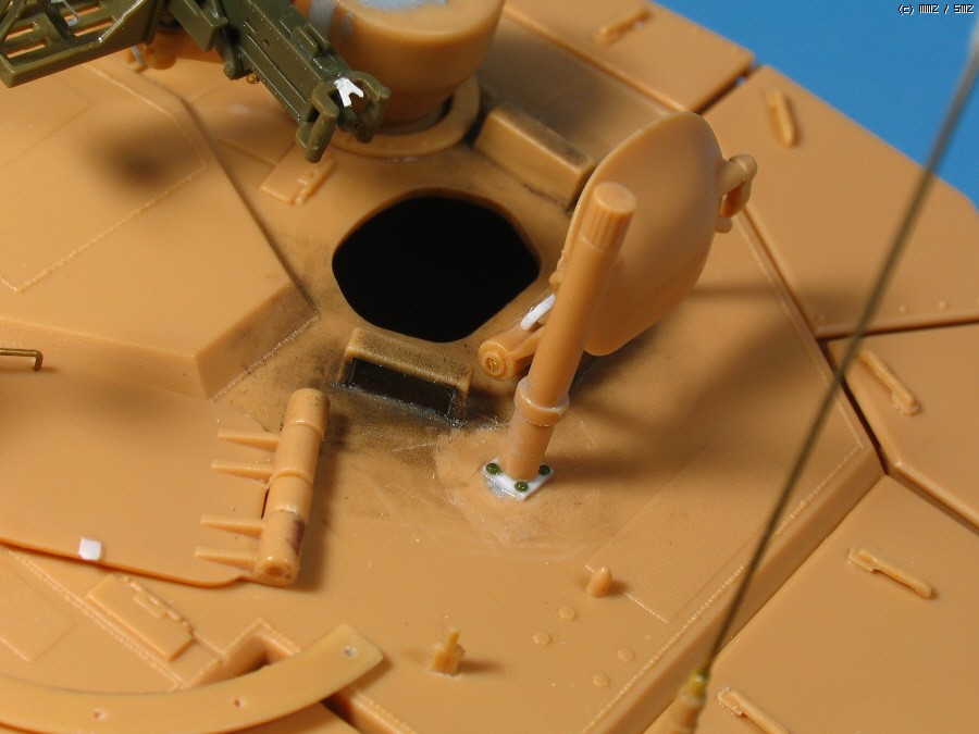 또 하나의 문제인 측풍 감지기.. 정해진 위치에 붙이면 탄약수 해치가 열리다 걸립니다. 약간 옆으로 옮기면 전차장 해치가 걸리고 결국 양쪽이 조금씩 최 소한으로 간섭하는 위치에 고정 했습니다.