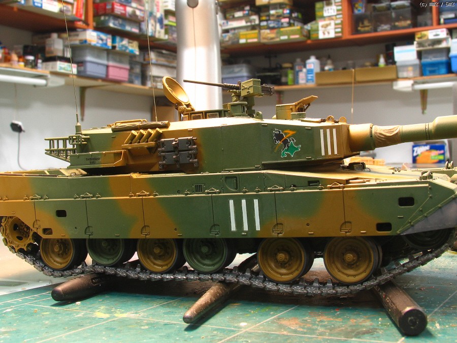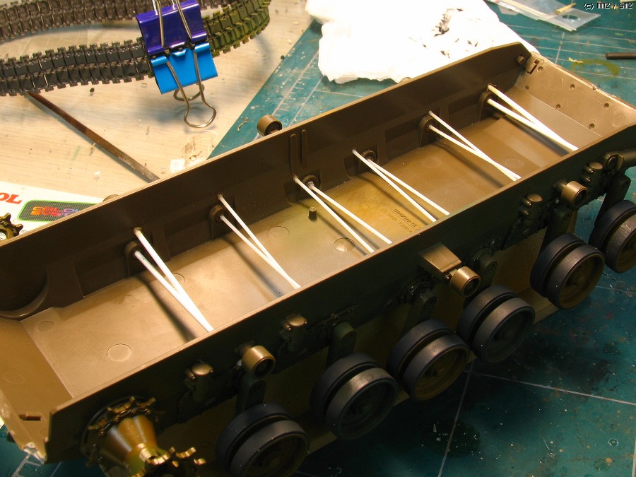 차체의 로드휠암이 접착되는 구멍부분을 막혔으면 뚫고 뻑뻑하면 암이 잘 움직이도록 넓혀줍니다. 굵은 드릴날이 있으면 편하죠.90식의 경우는 그럴 필요가 없어서 수월했습니다.