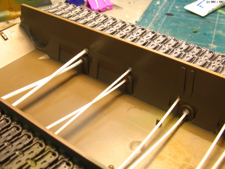 1.0mm봉은 중간에,1.5mm봉은 첫번째와 마지막 로드휠 암에 적용합니다. 첫번째와 마지막 휠은 제일 힘을 많이 받기 때문이죠. 실제 전차도 이부분에 쇼바를 추가하는 등으로 보강합니다.