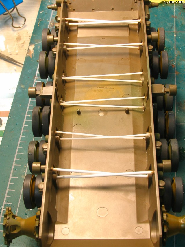 차체 안쪽에 얼기설기 설치된 것이 플라봉으로 봉의 양끝단 중 한쪽은 차체에 고정하고 다른 한쪽은 로드휠 암의 허브에 고정합니다. 로드휠 암을 차체에 접착고정하지 않으면 비틀림 특성으로 움직이게 되는데, 바퀴는 기동륜암을 통해서 아래 위로 큰 폭으로 움직이지요.