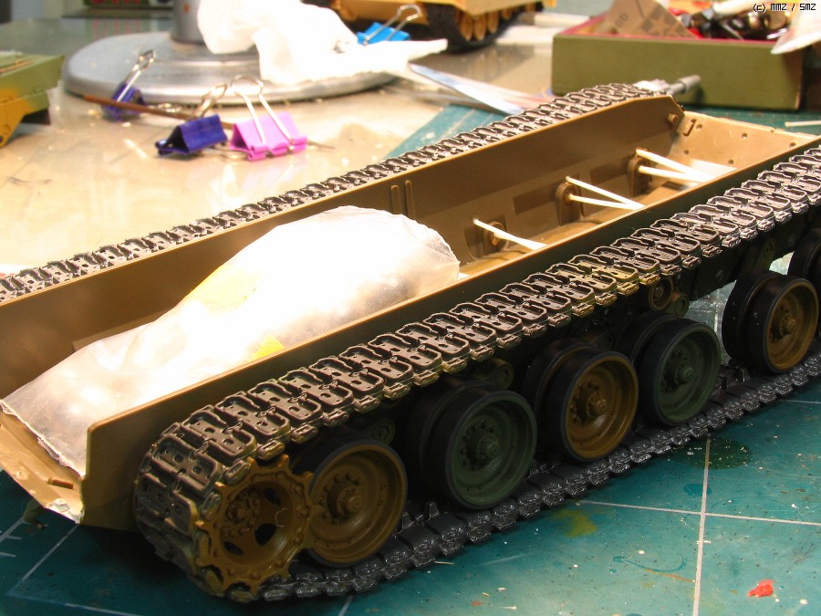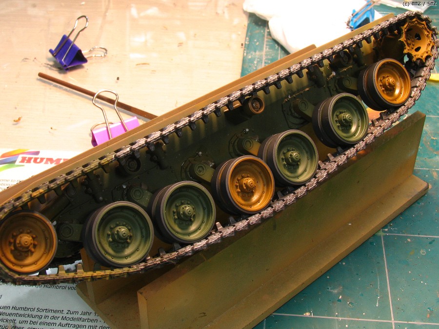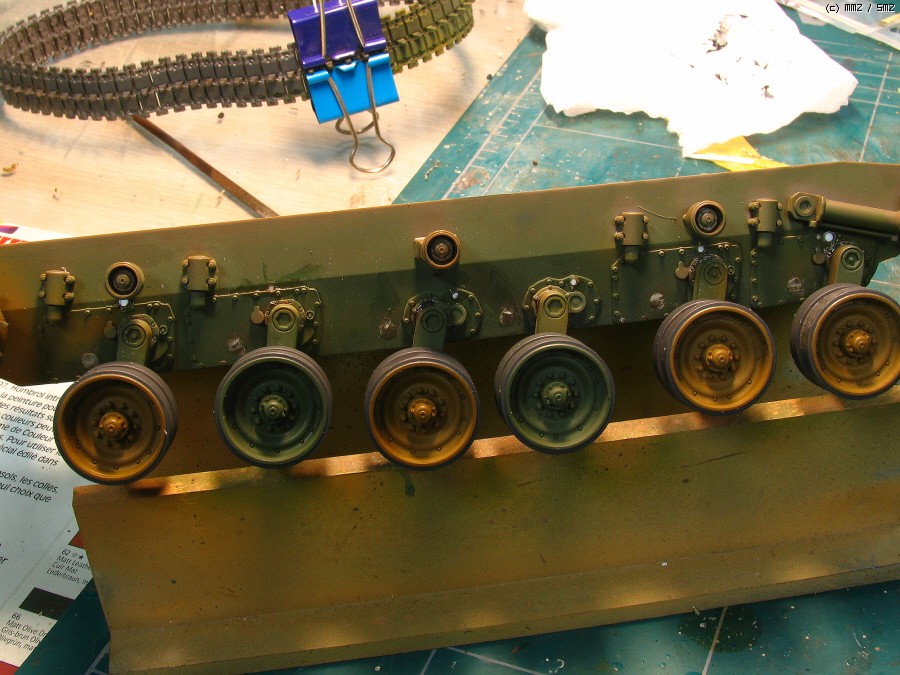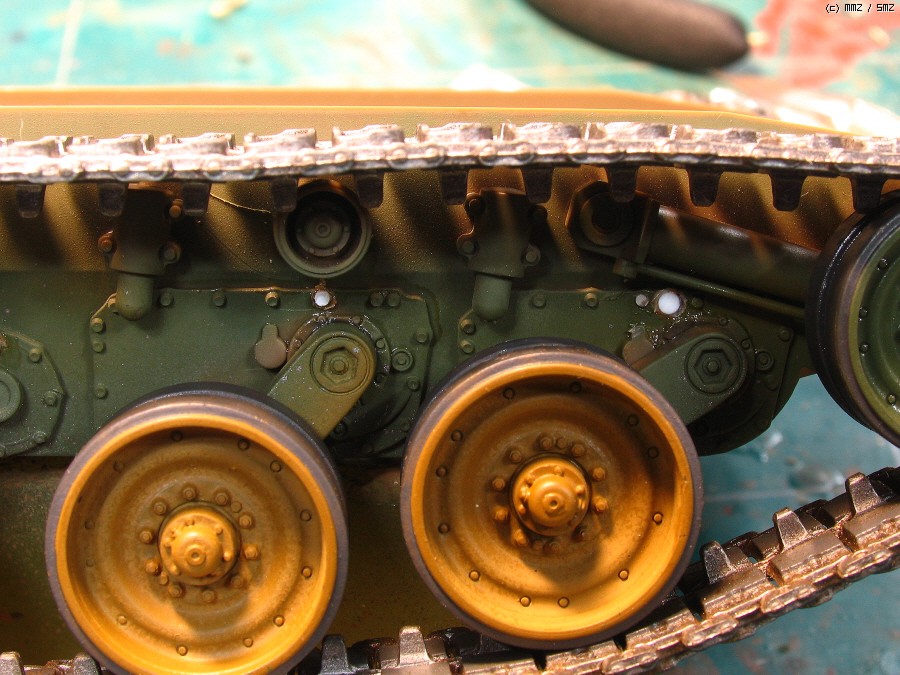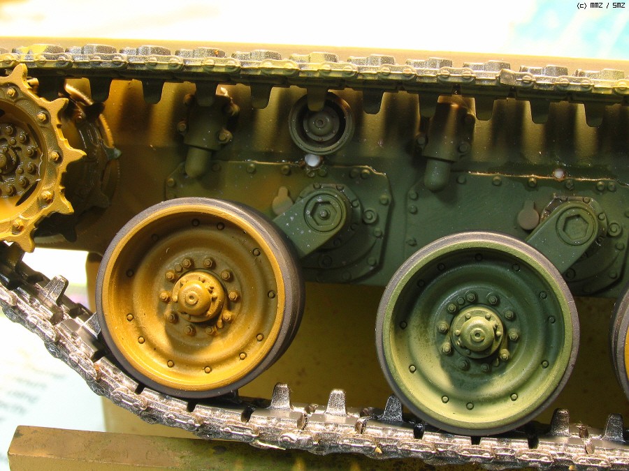 더해서 굴리지는 않더라도 가동 서스펜션의 원활한 작동을 위해서 바퀴들이 구를 수 있으면 좋습니다. 바퀴가 고정되면 궤도와 바퀴의 마찰 때문에 상하 작동이 원활하지는 않게 되더군요.