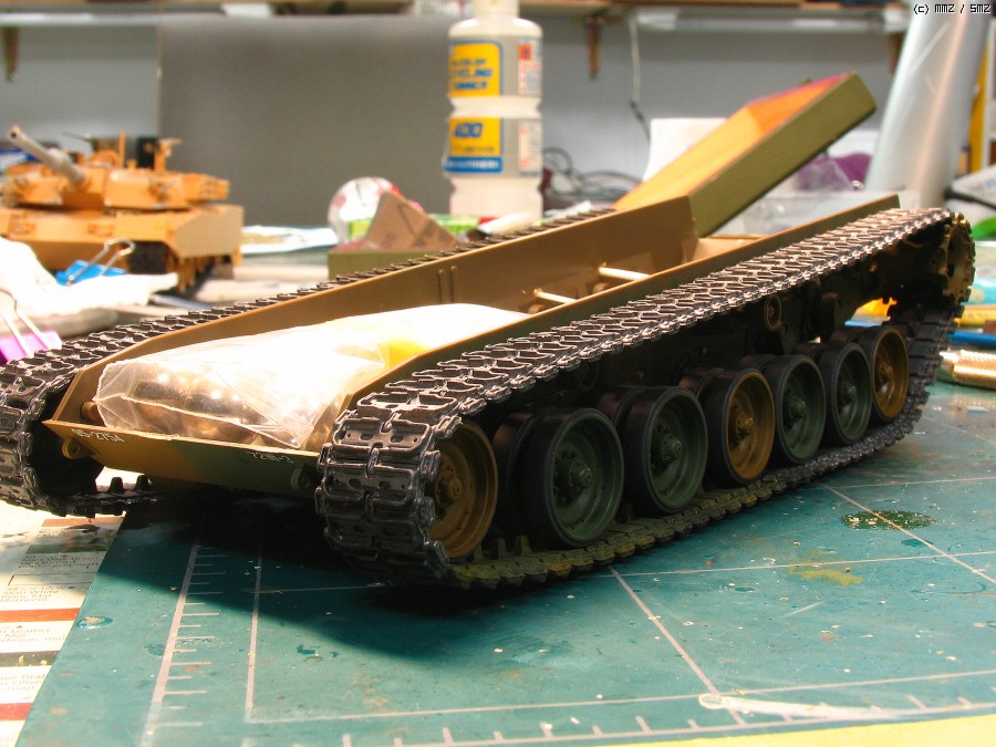 90식의 경우도 차체상판 까지 접착 후에 무게추 넣고 시험하다가 맨 앞의 토션이 파손 되었는데 사이드 스커트 발걸이 구멍을 통해서 수리 재 장착 했습니다.