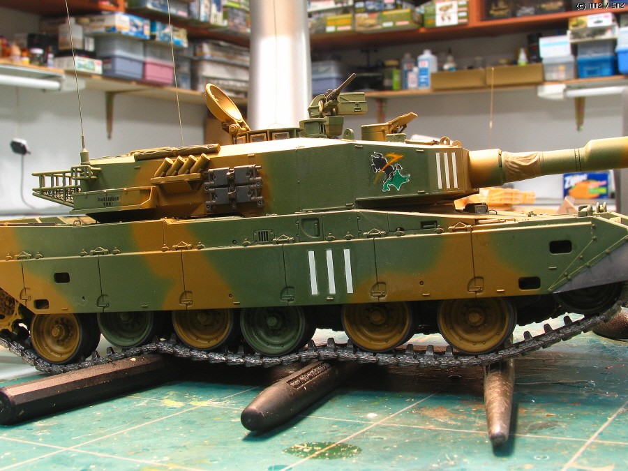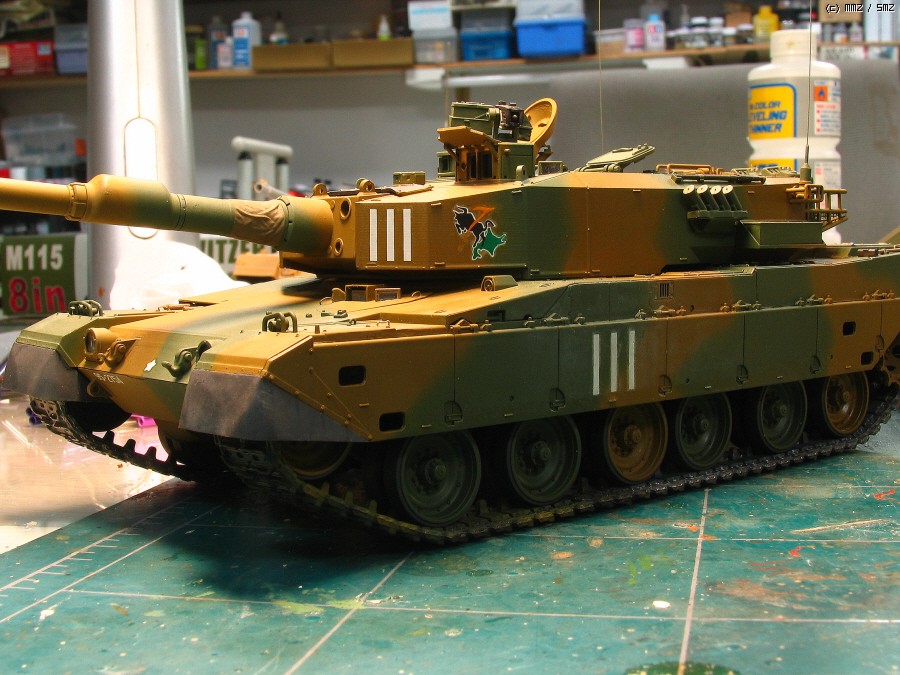 비닐봉지에 쇠구슬 넣은 무게추(재료는 상관없슴)를 놓으면 토션바의 높이를 조절할 수 있고, K1A1전차와 같이 유기압 서스펜션으로 자세 조정이 가능한 90식처럼 앞뒤로 조정 가능 합니다.