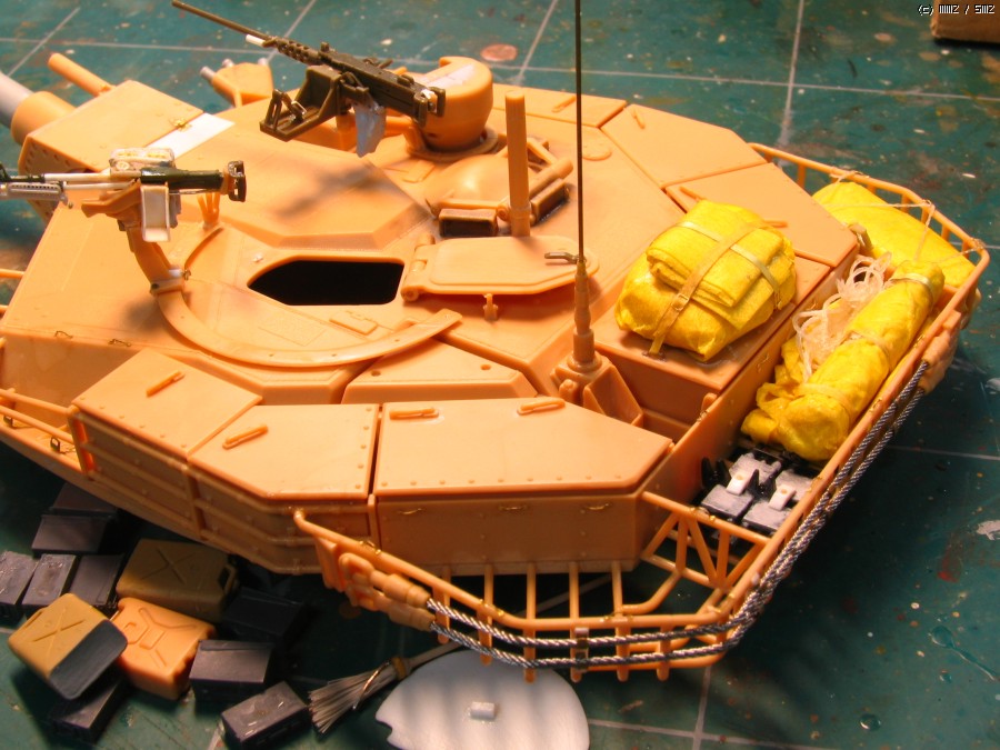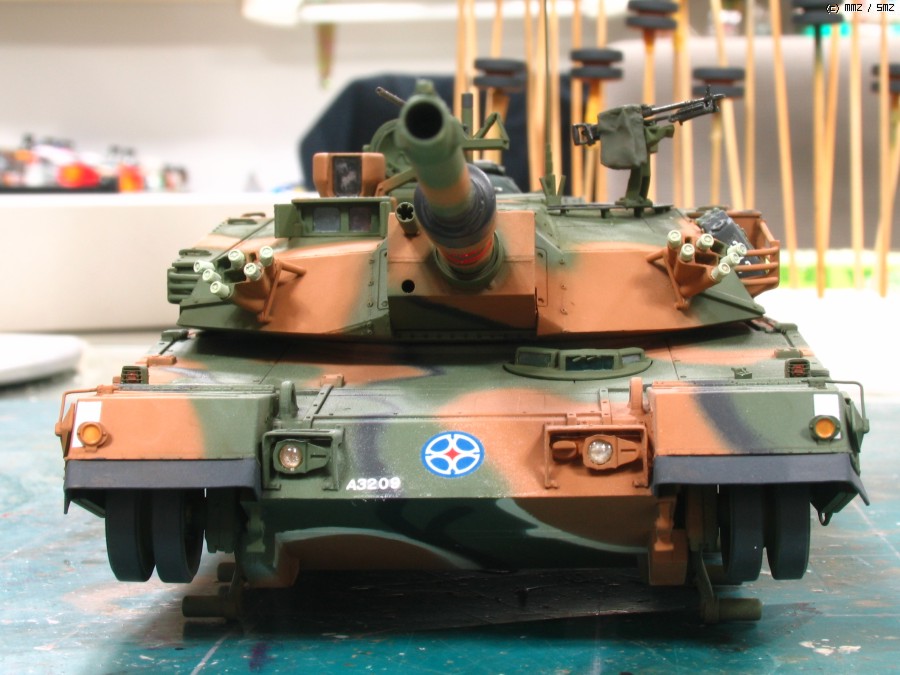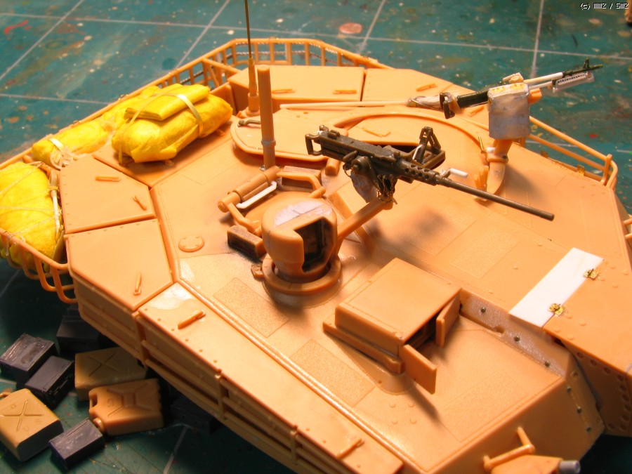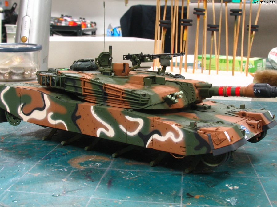아카데미 K1A1 입니다. 전번에 워크 벤치에 올린 이후에 장비품 올리는 작업 했고, 육군의 4색 위장 .... 특히 흰줄과 검은 줄 무늬는 사람을 반쯤 미치게 합니다. 육본에 위장 바꾸라고 건의 하고 시플정도로..