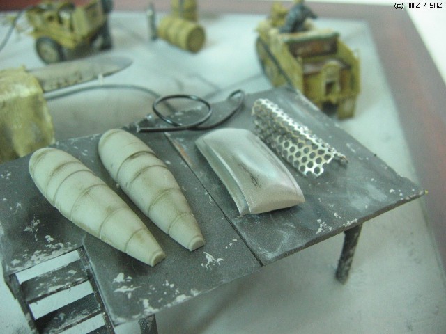 몇가지 부품을 주어모아 작업대에 배치해 보았습니다. 현실감은 전혀 없이 이런 부품들이 필요할꺼야 하구 생각해서 올려 놓았습니다. 작업대는 발사나무롤 만든 후 상판은 금속판을 약간 구겨 붙여 놓았습니다.