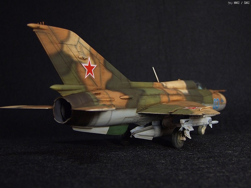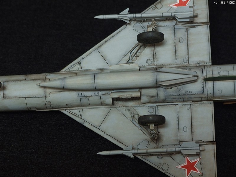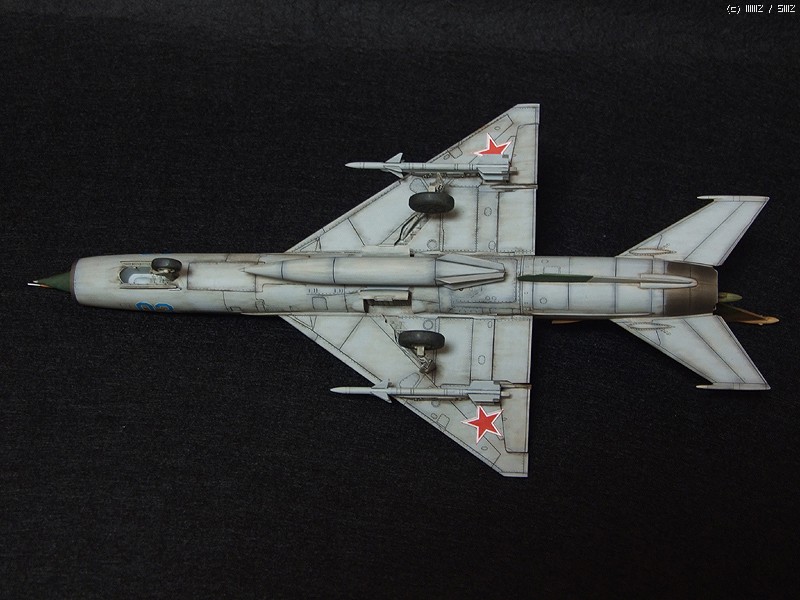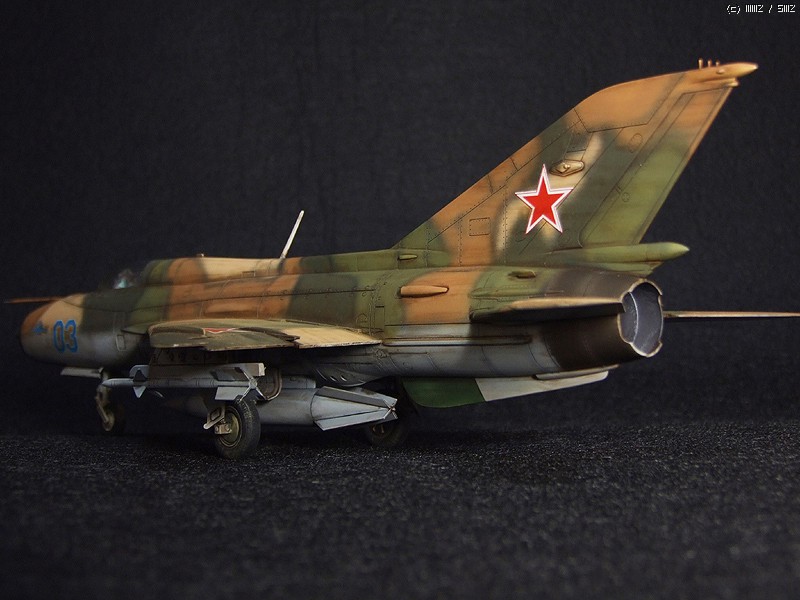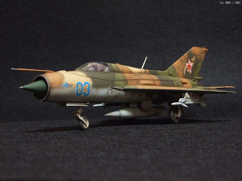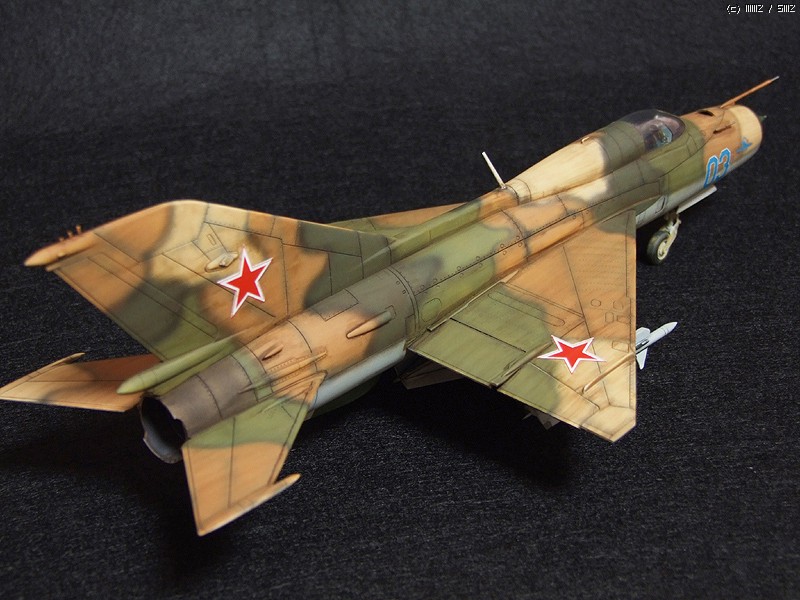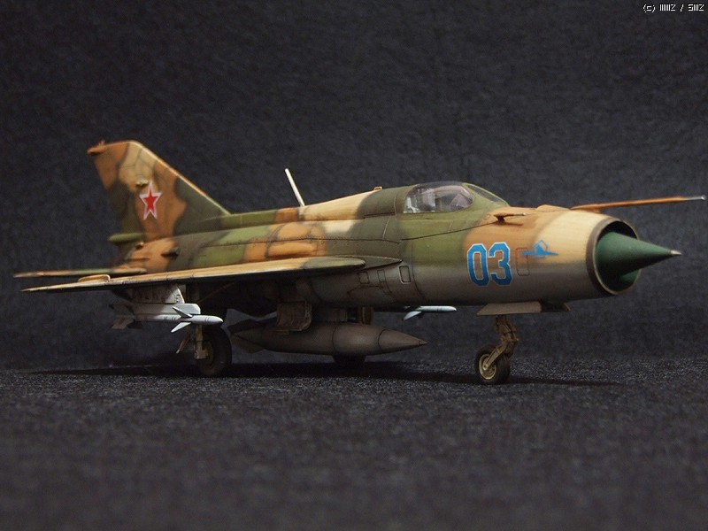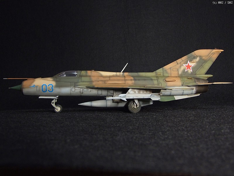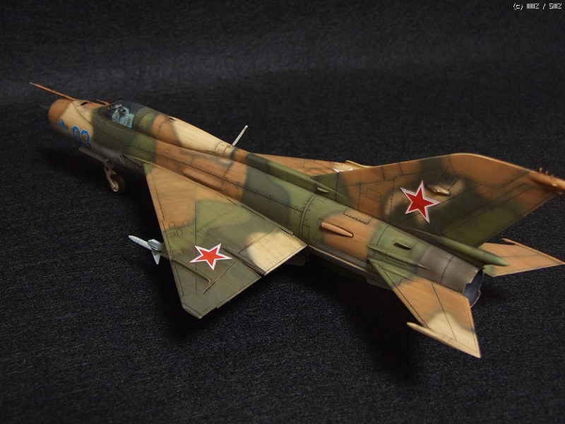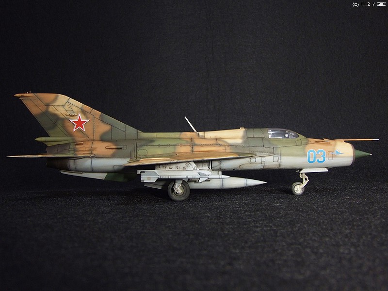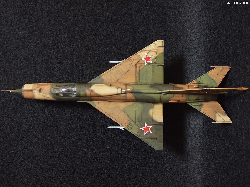 이 킷에서 데칼의 품질이 좋치않다는 사전지식으로 별매 데칼을 사서 붙였으나, 마크소프터와의 반응성이 좋치않은 지 소프터와 닿은 데칼이 전부 베이킹파우더에 밀가루 반죽 부풀어오르듯 일어나더군요..그래서 하는 수 없이 아카제 미그21 MF 형 킷 하나를 더 사서 구소련 국적기 마크를 사용해서 완성하였습니다. (하나 더 늘어난 미그 21MF를 언제고 만들어야겠습니다^^)